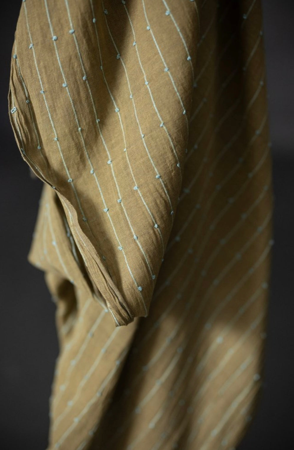 A slubby Indian checked cotton with woven colourful loops. A sage green background with aqua loops.