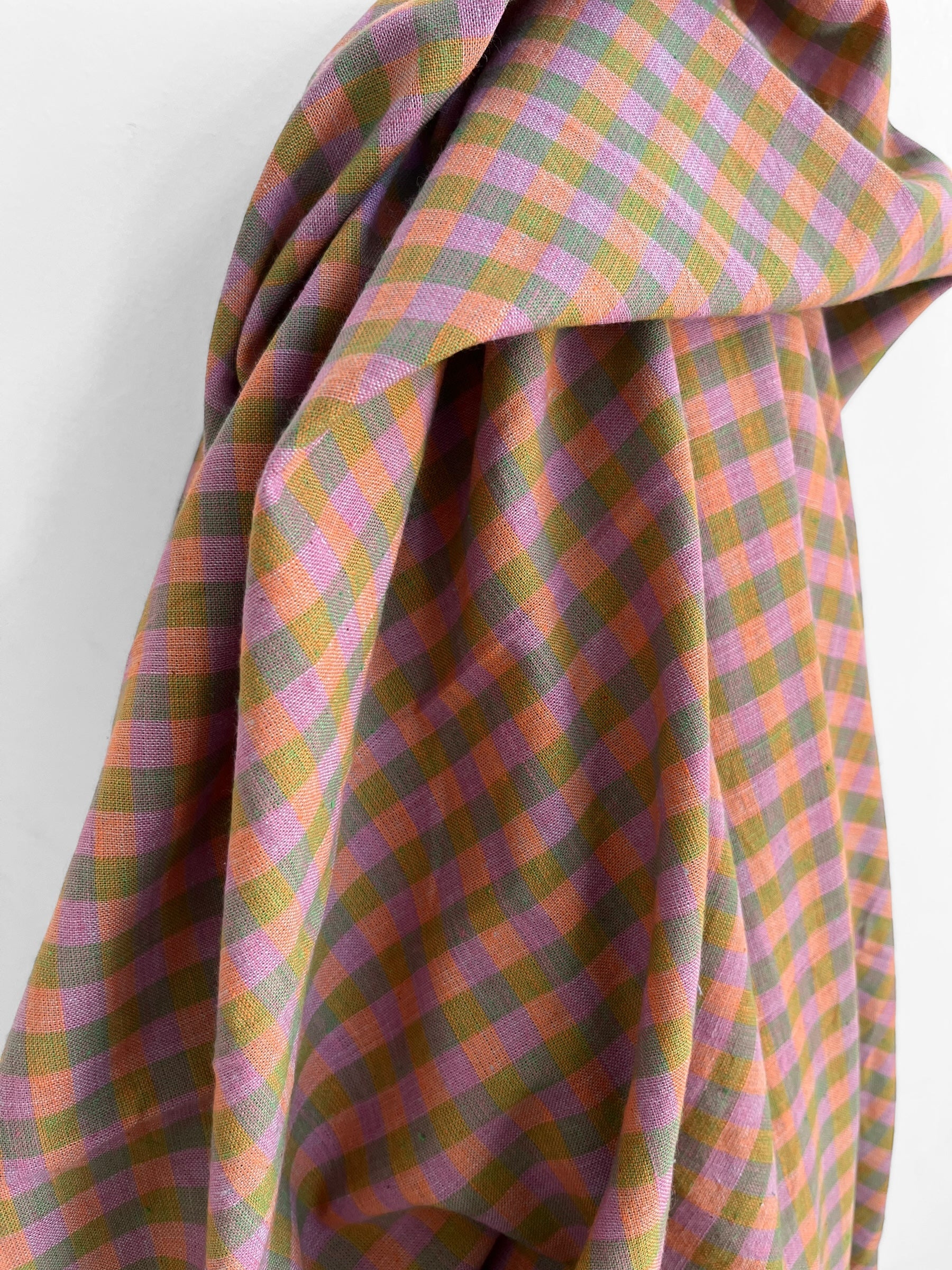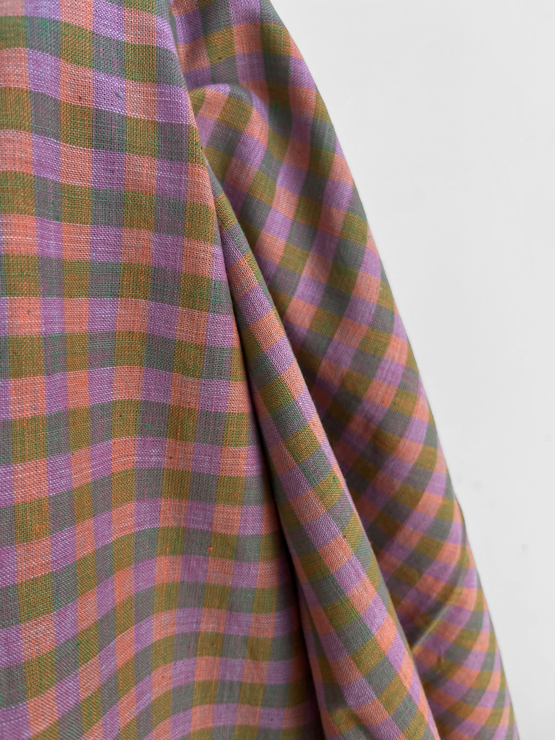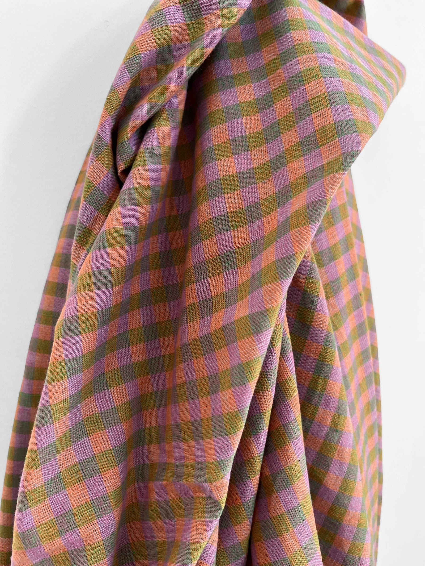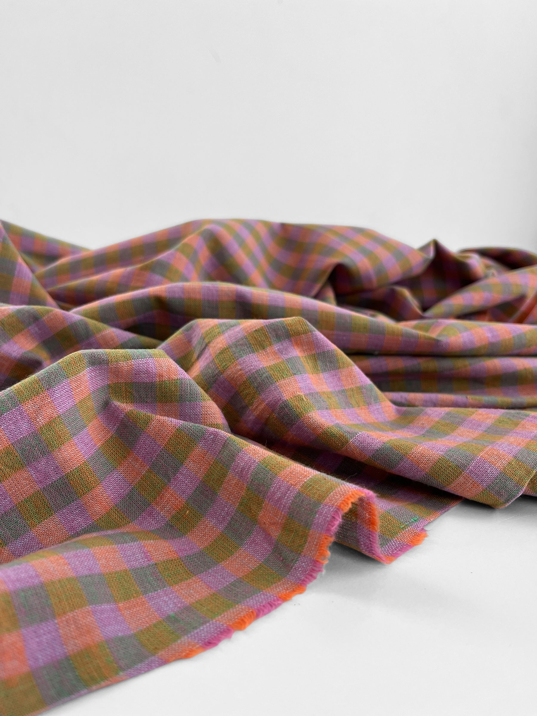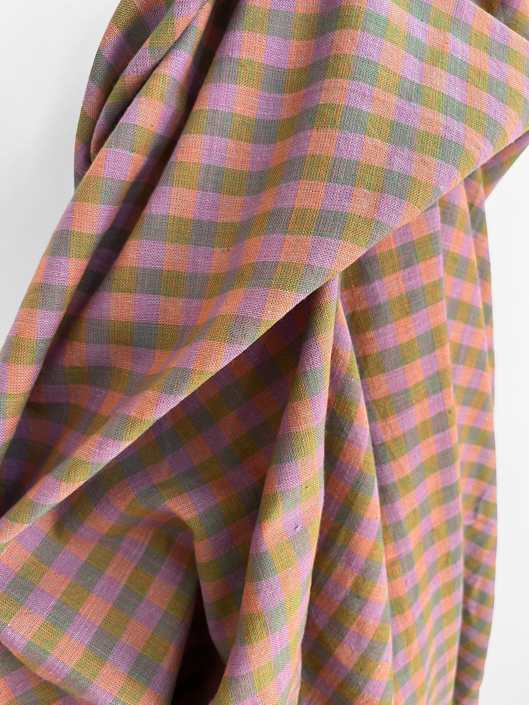 A beautifully soft premium cotton handwoven in rural Bengal, India, featuring a timeless yet unique stripy pattern. The colours include an olive green, mauve and orange.