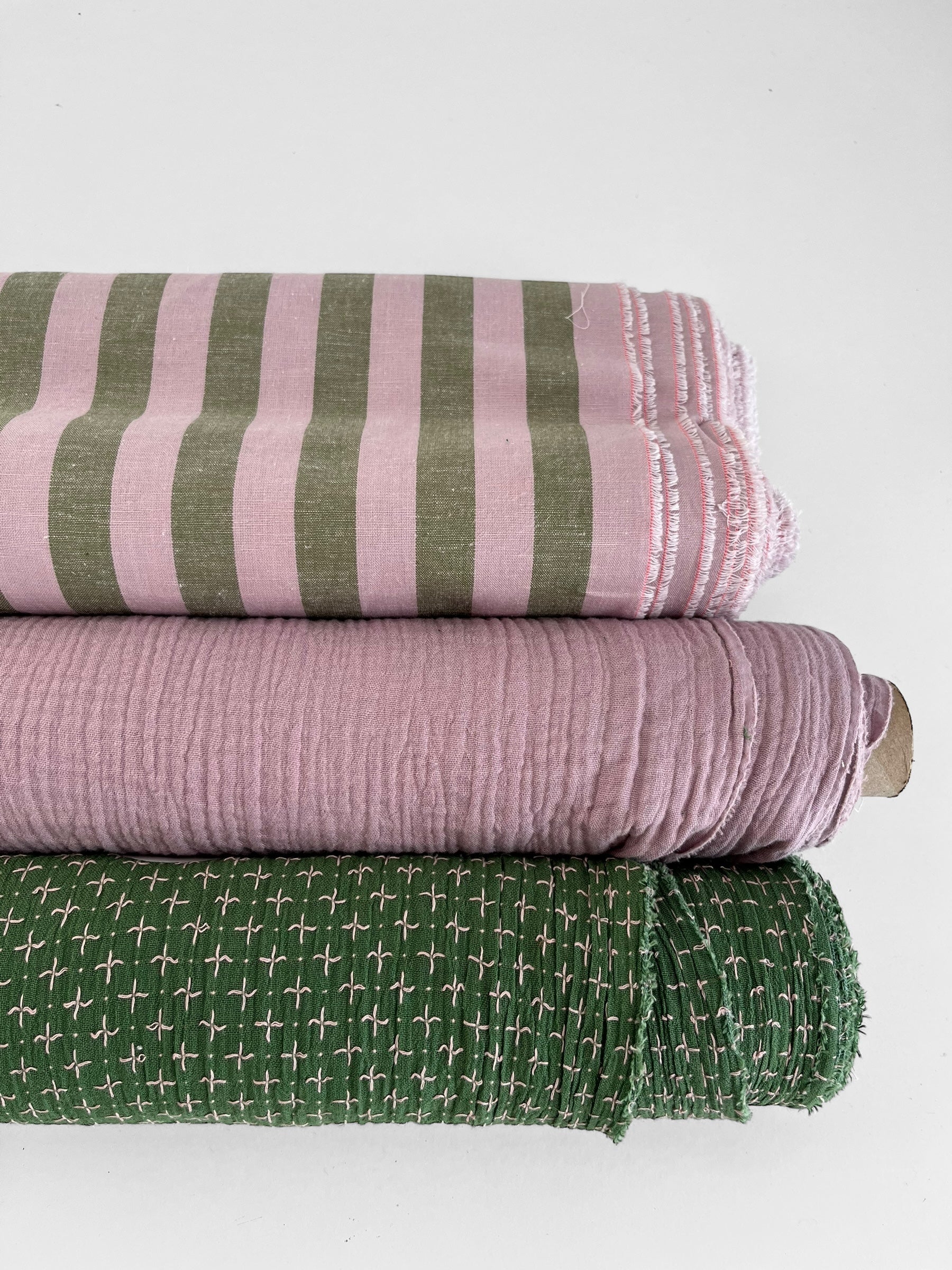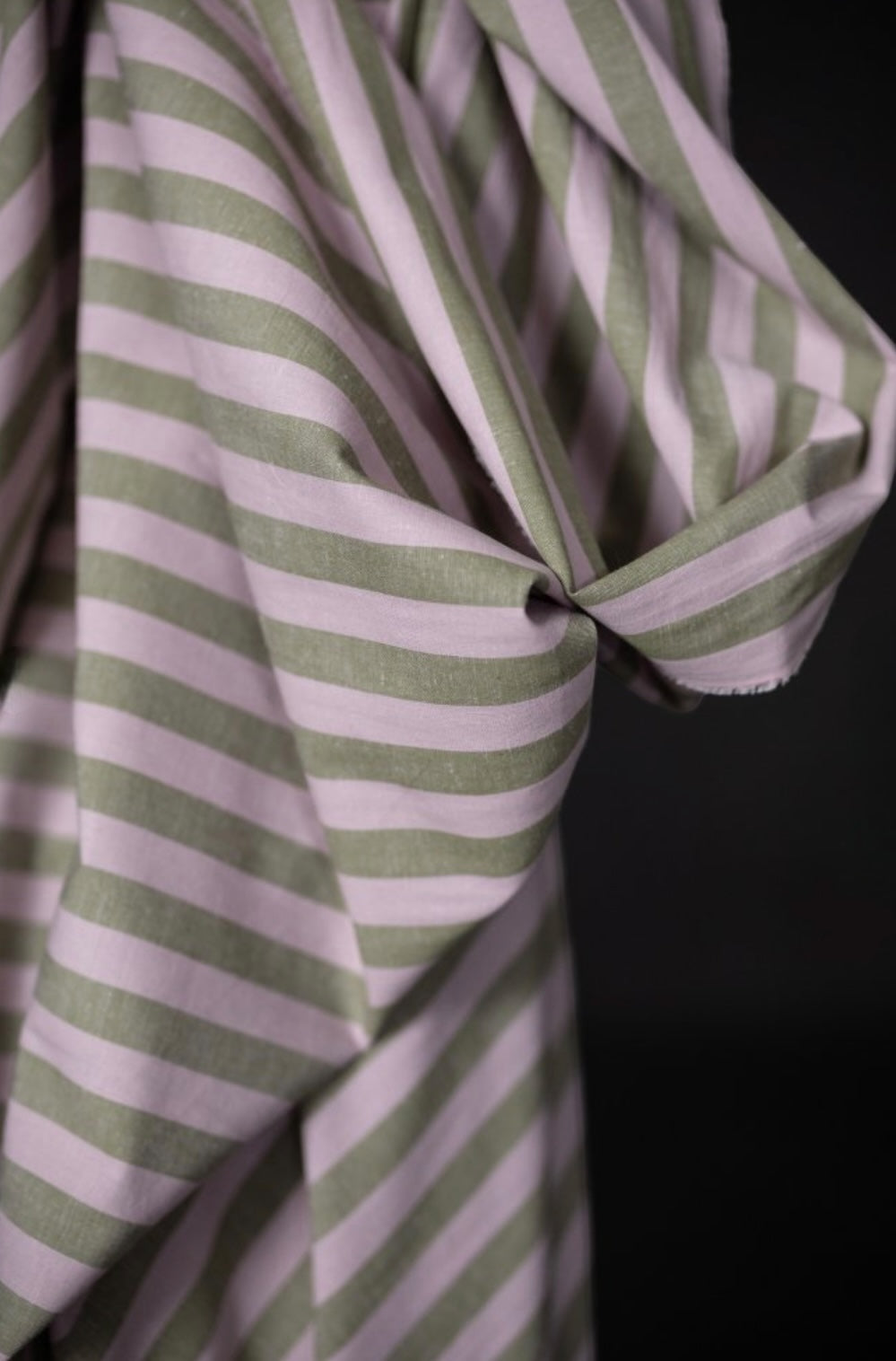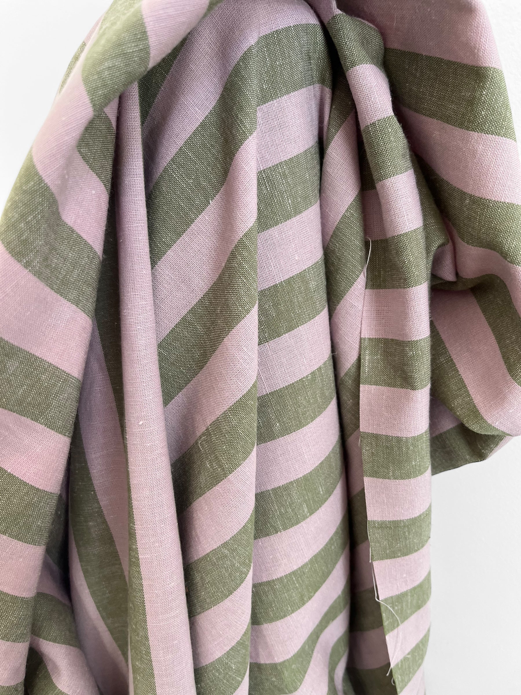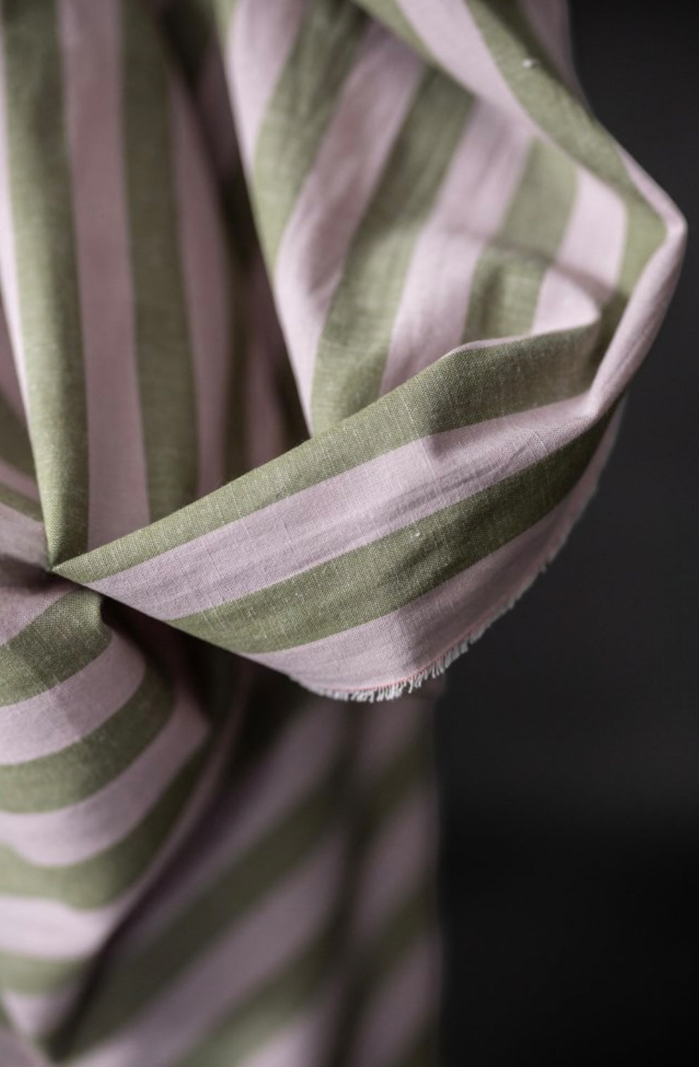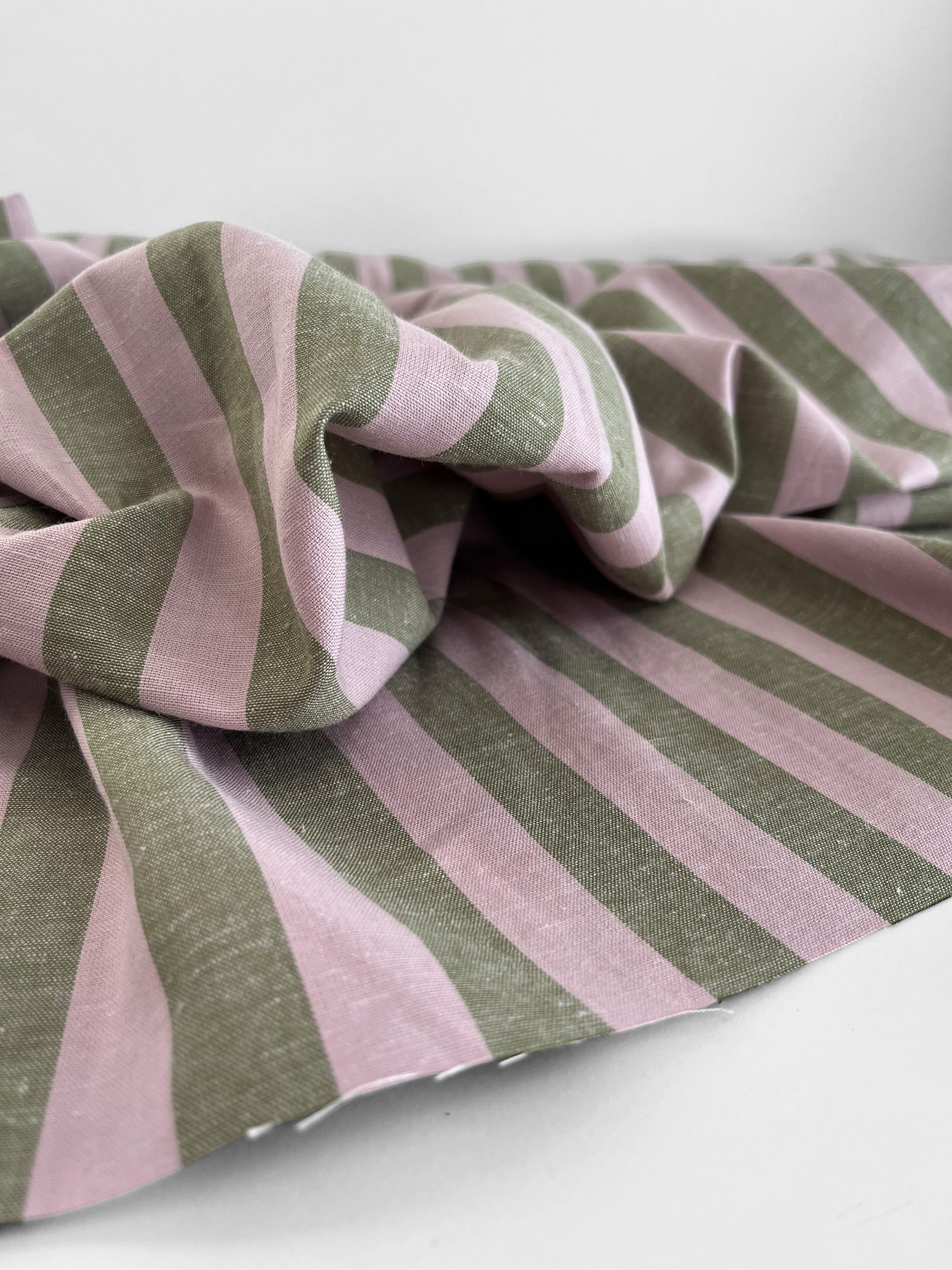 A wide stripe in olive green and pale pink by the iconic Merchant & Mills.