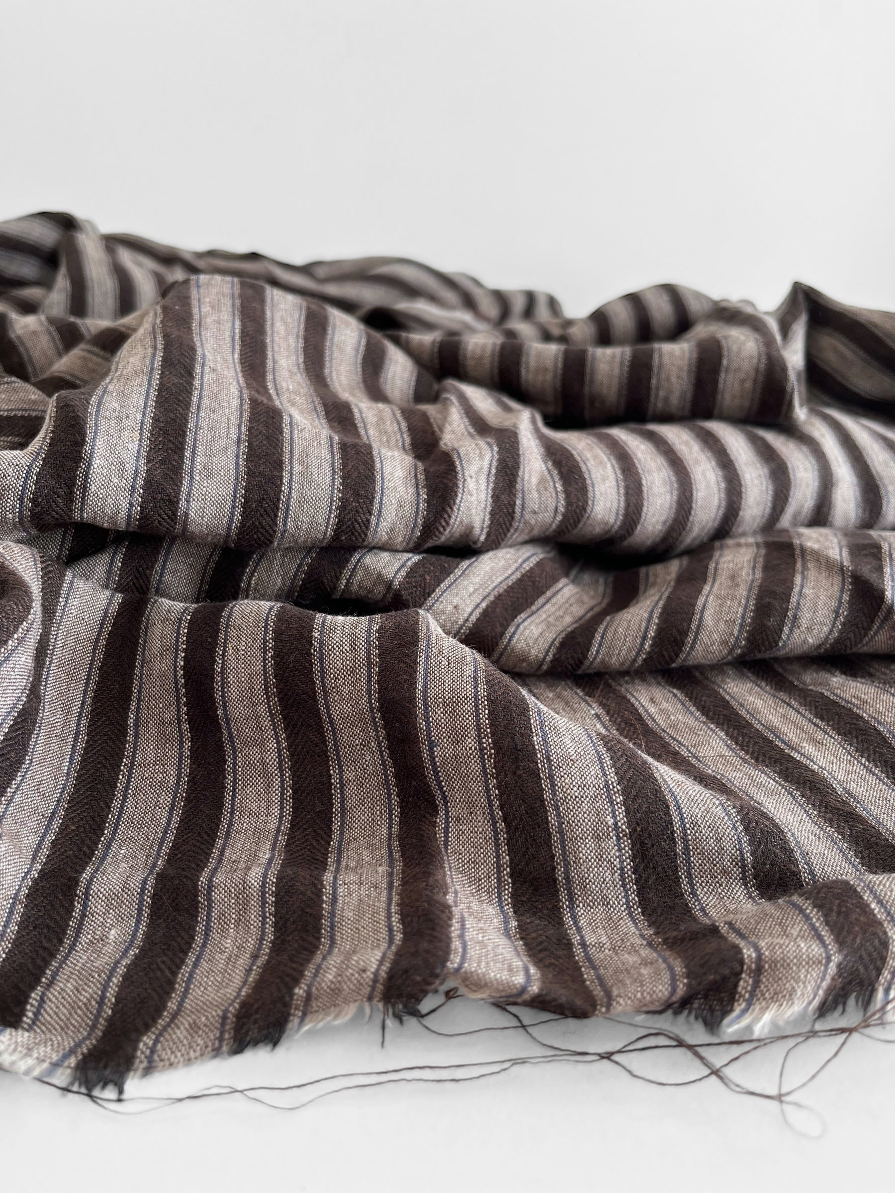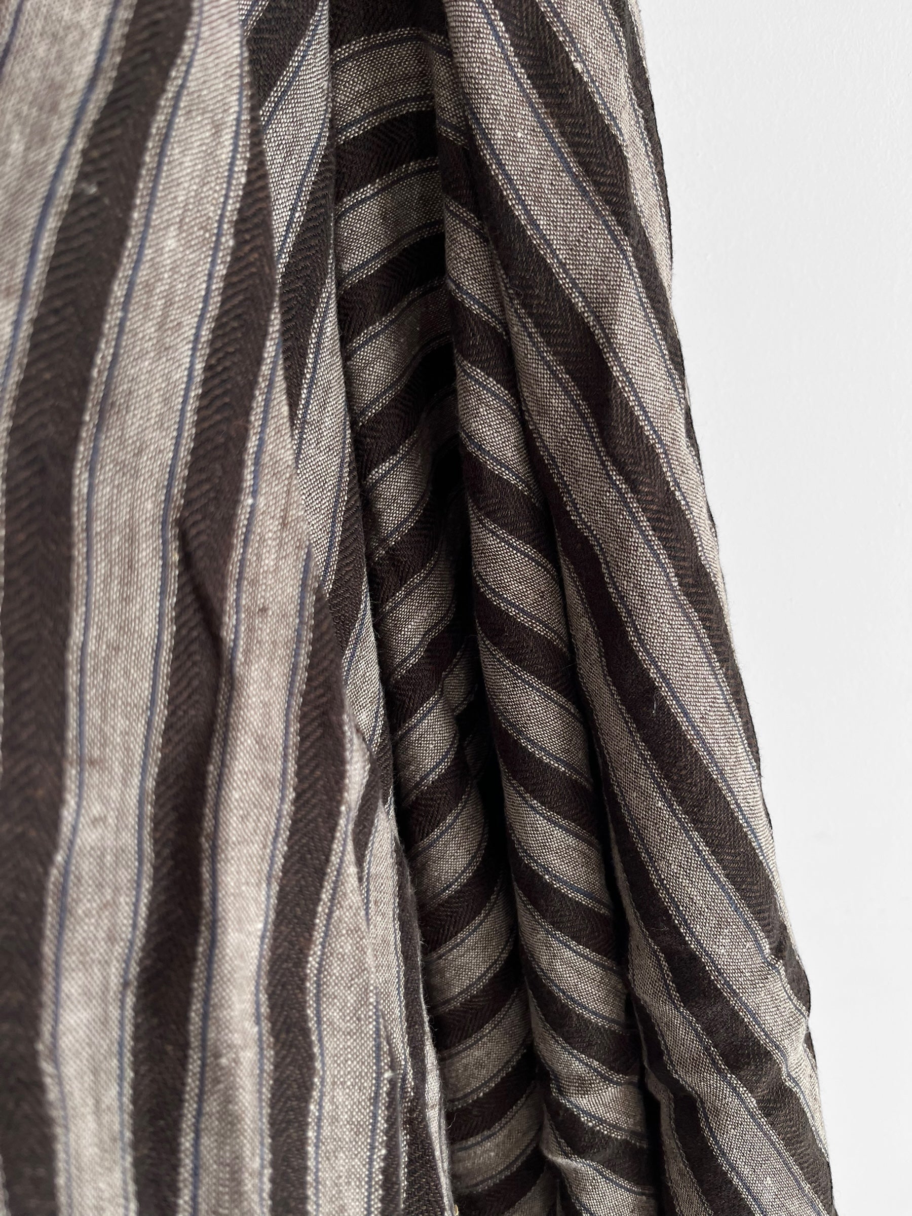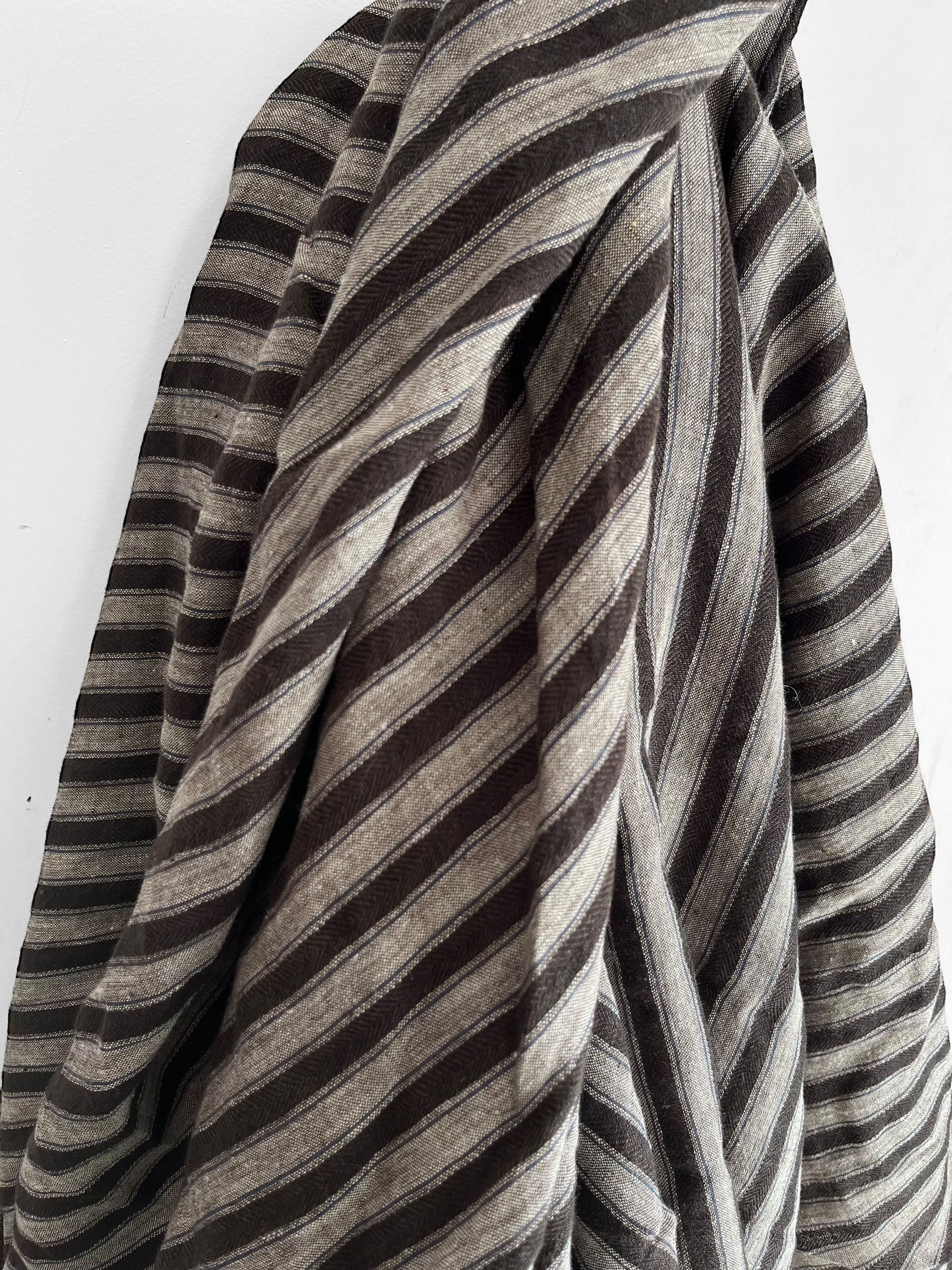 The main centre stripe measures ca. 1cm and features a subtle herringbone texture. It is flanked by two delicate pinstripes, creating a timeless look with a rustic feel. The colours include a dark brown (centre stripe), navy (side pinstripes) and medium greyish brown (background).