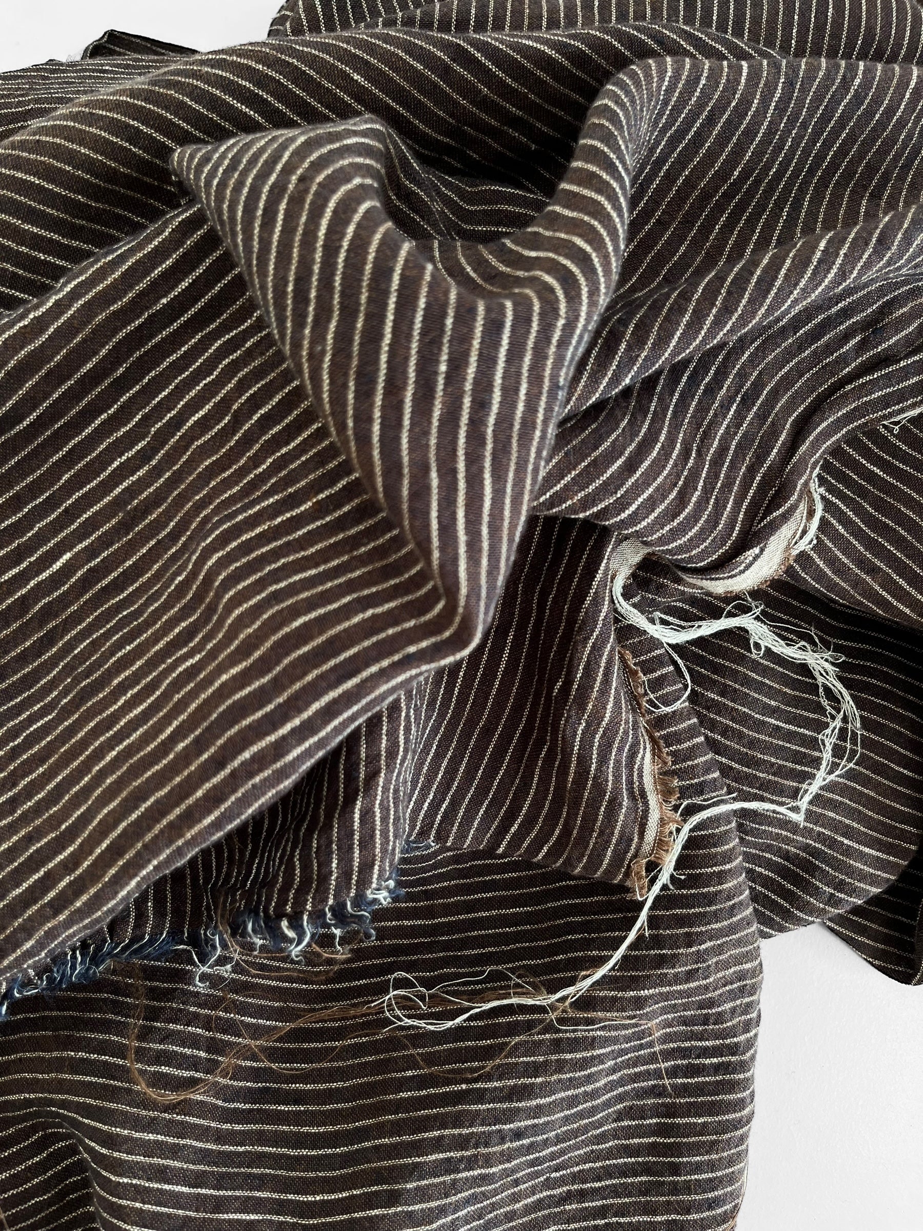 Woven out of 3 coloured yarn giving it a unique melange look. The colours include: warp - navy and white (pinstripe), weft - chocolate brown