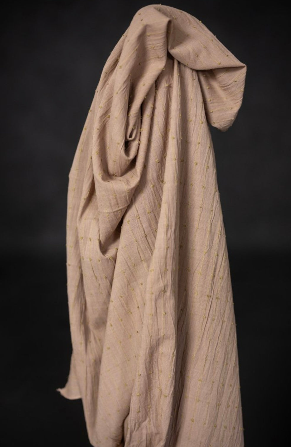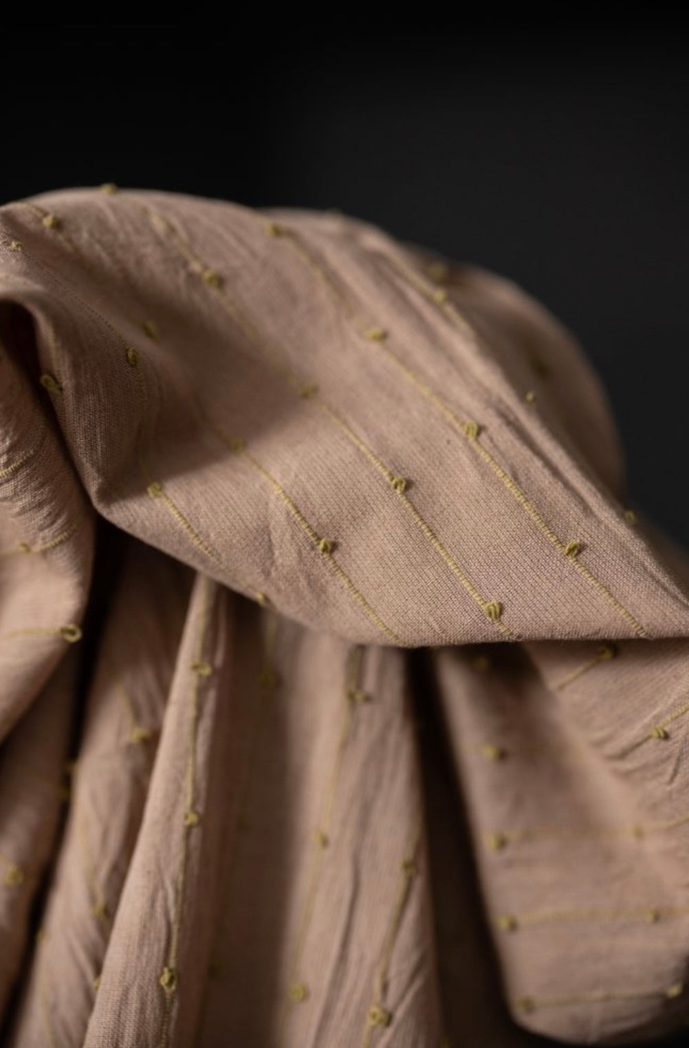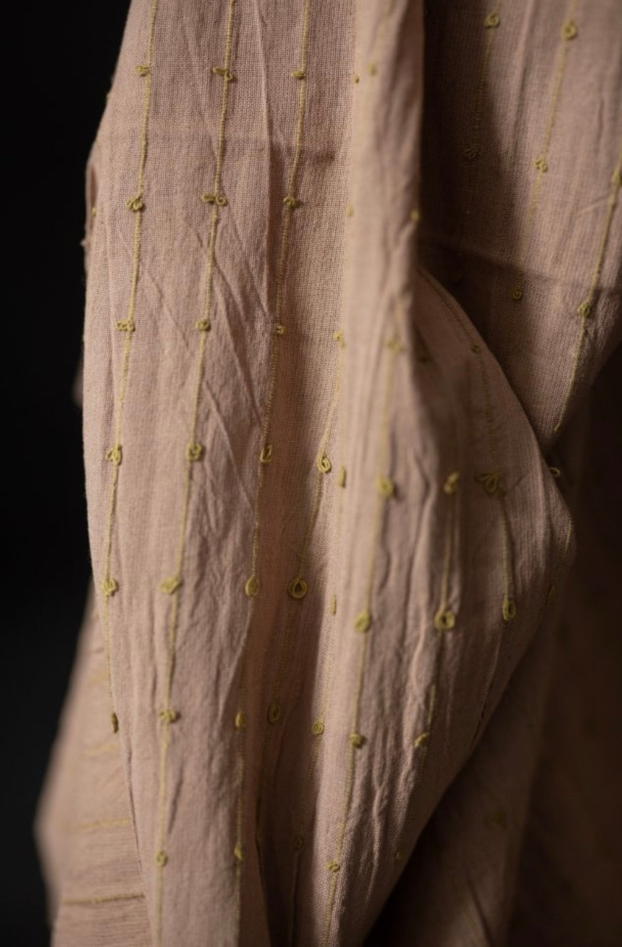 A slubby Indian checked cotton with woven colourful loops. A soft dusty pink background with pale yellow loops.