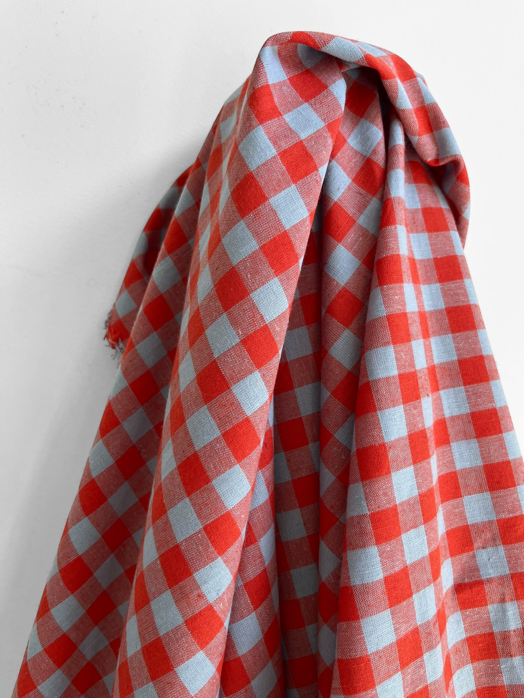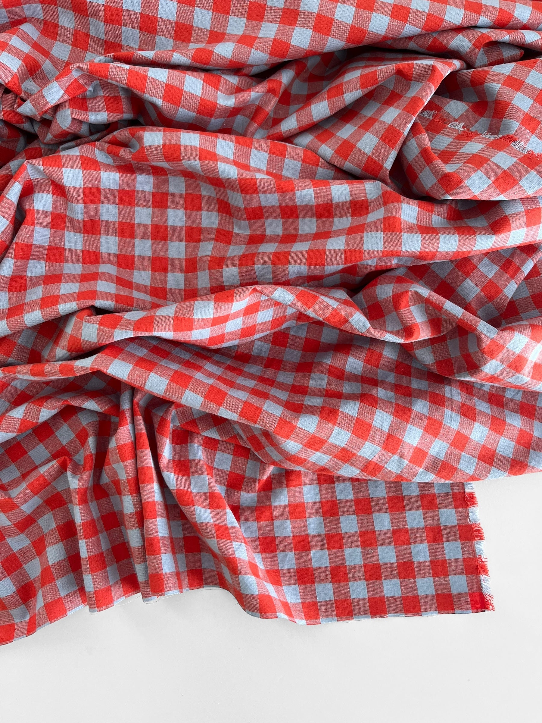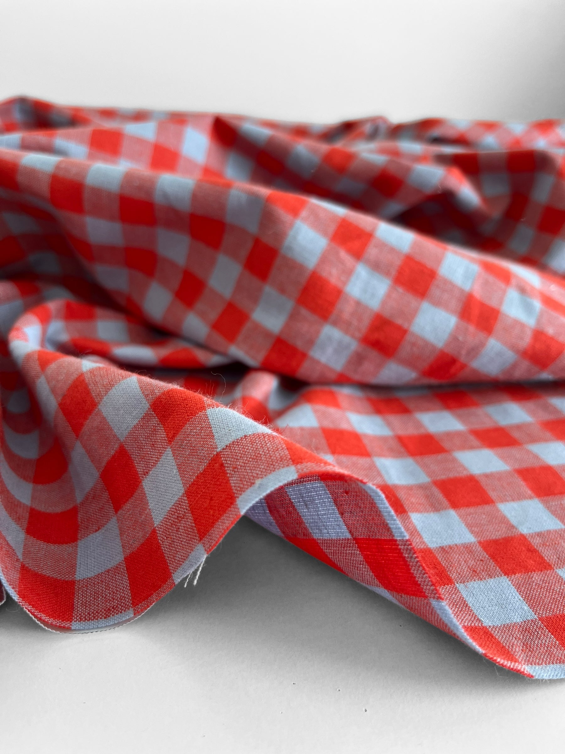 A soft pastel blue and bright red gingham by the iconic Merchant & Mills.
