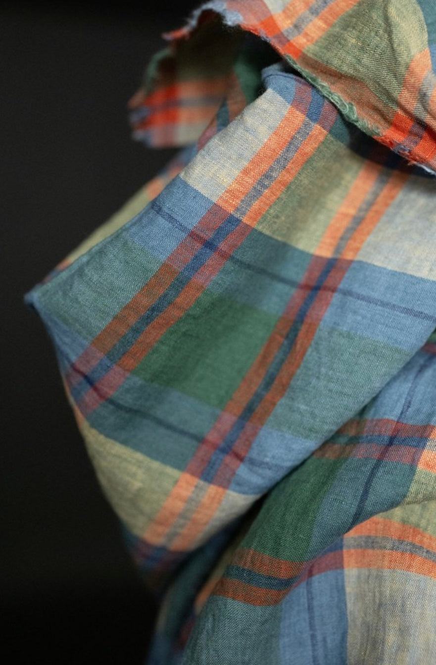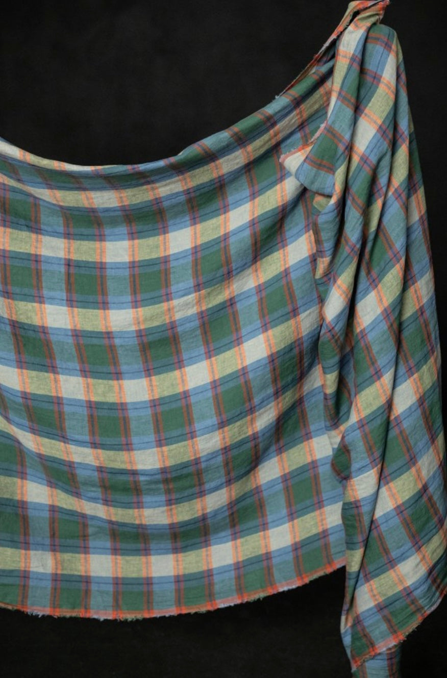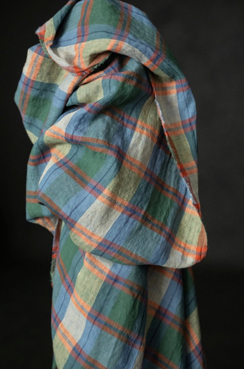 It features a multicoloured check in tones of bright orange, blue, forest green, and buttery yellow.