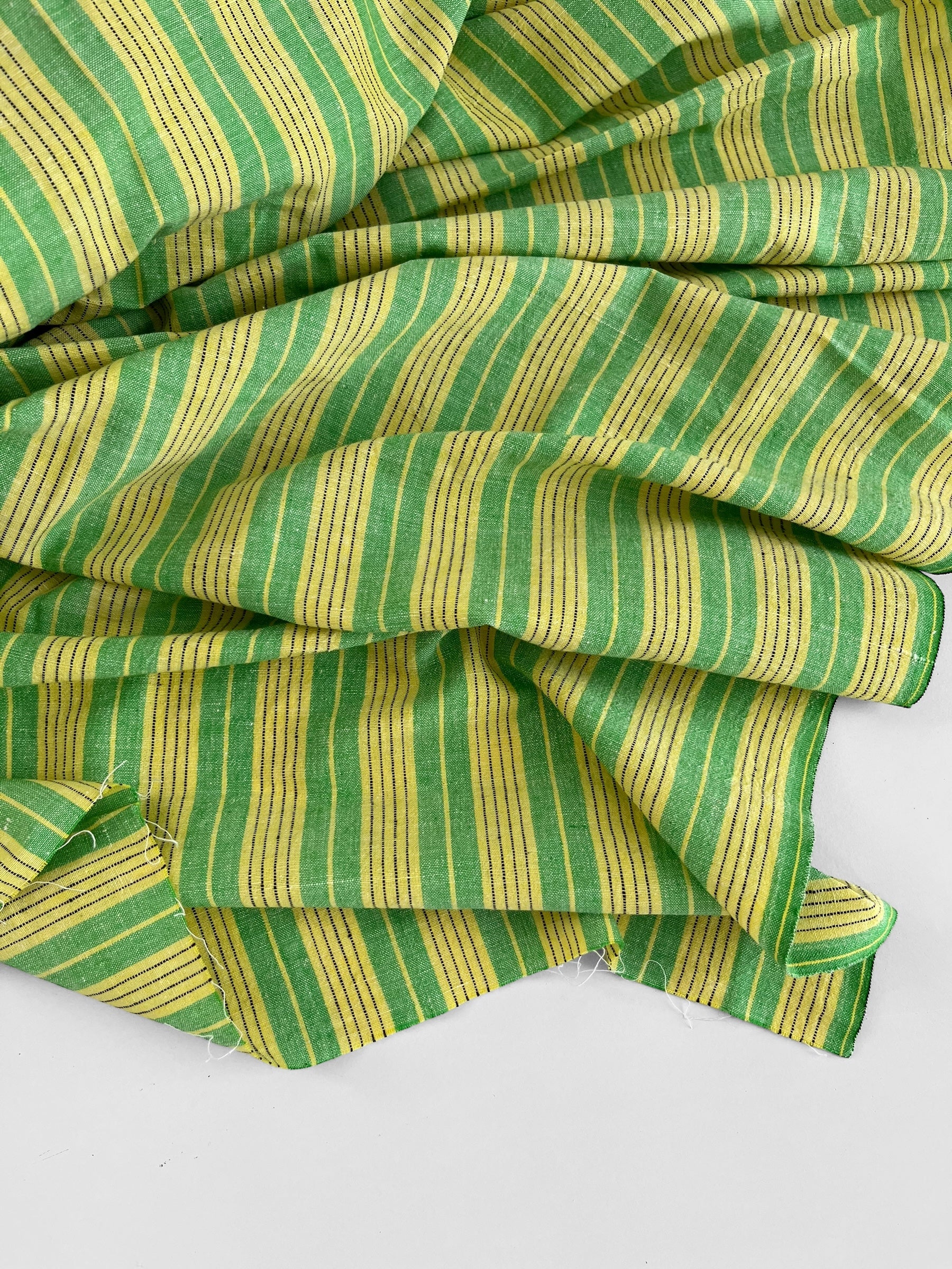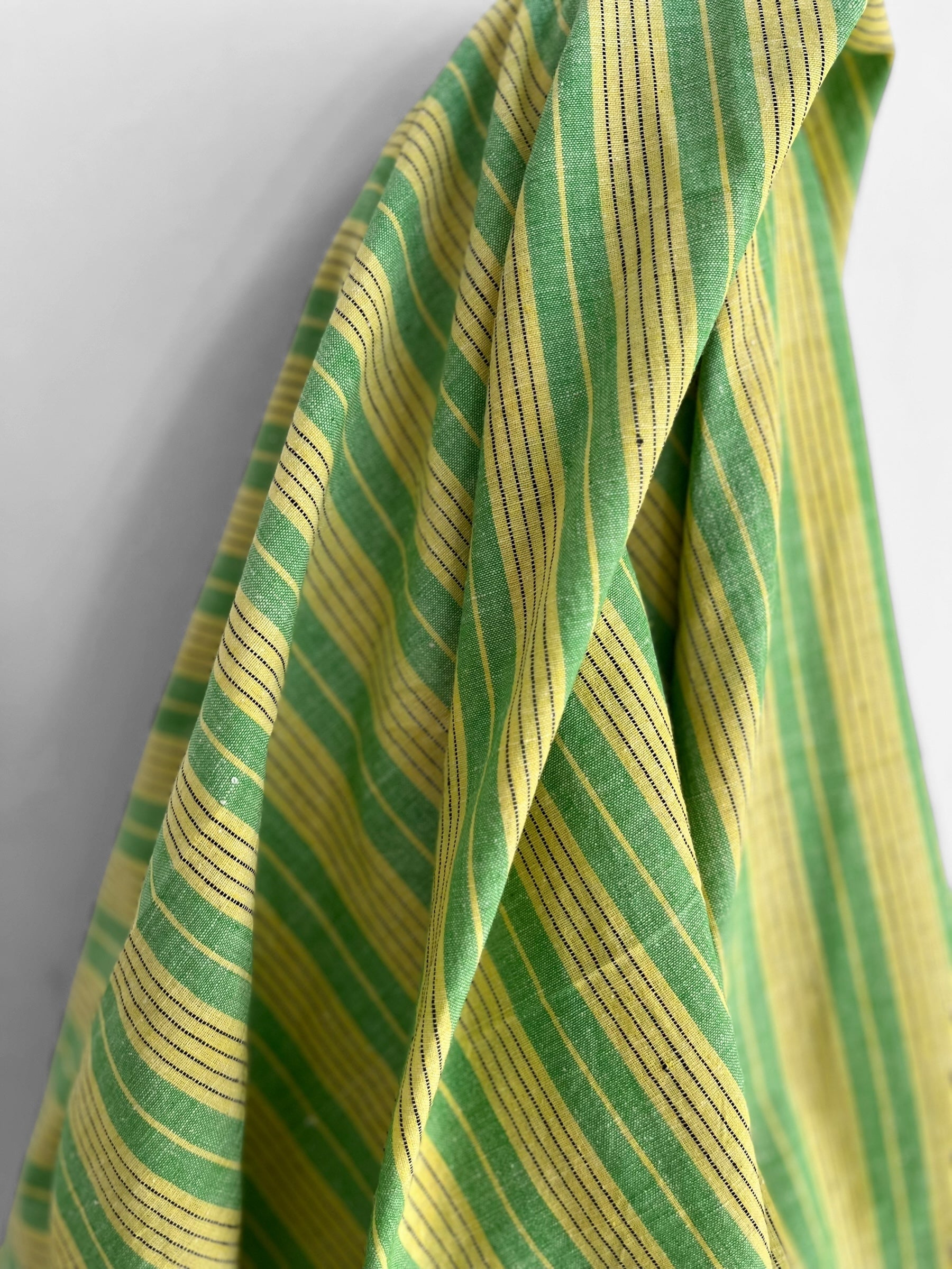 A beautifully soft premium cotton handwoven in rural Bengal, India, featuring a timeless yet unique stripy pattern. The colours include a yellow, green and touches of black.