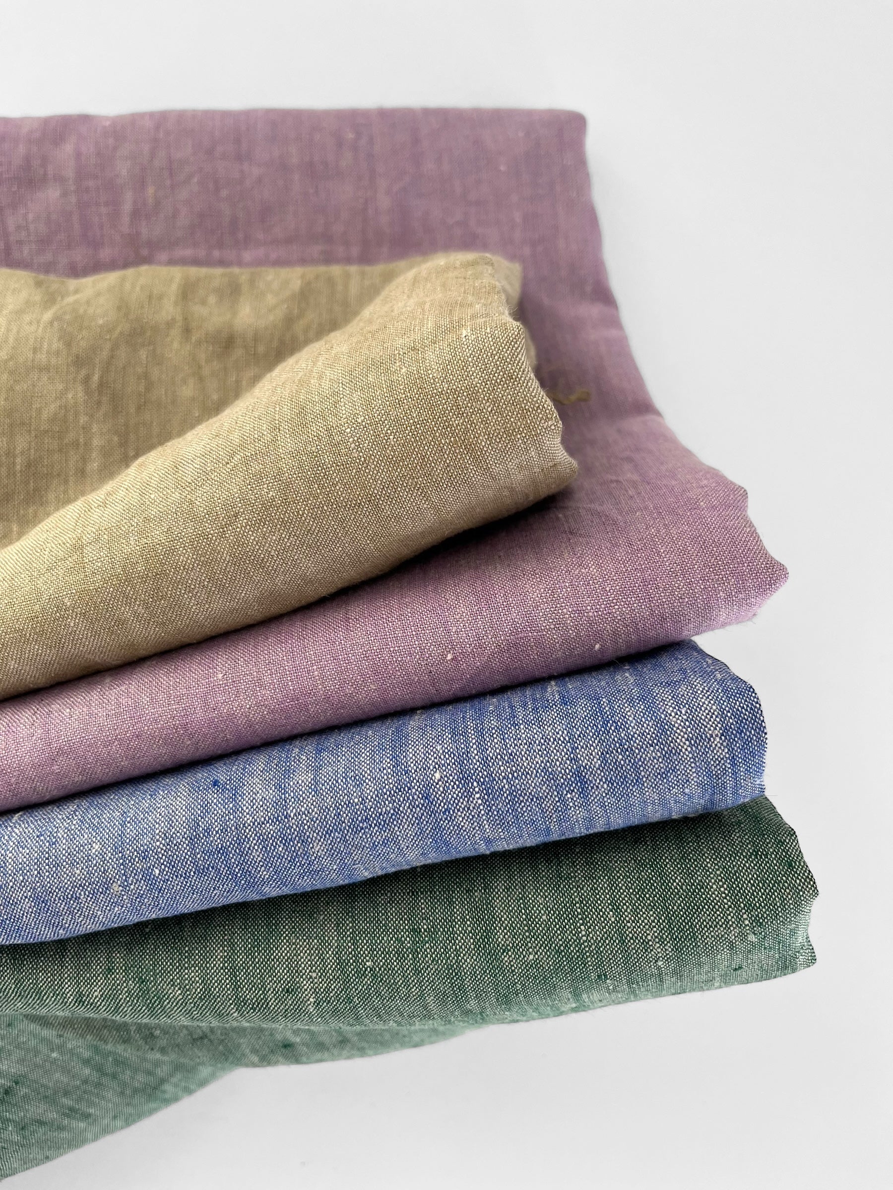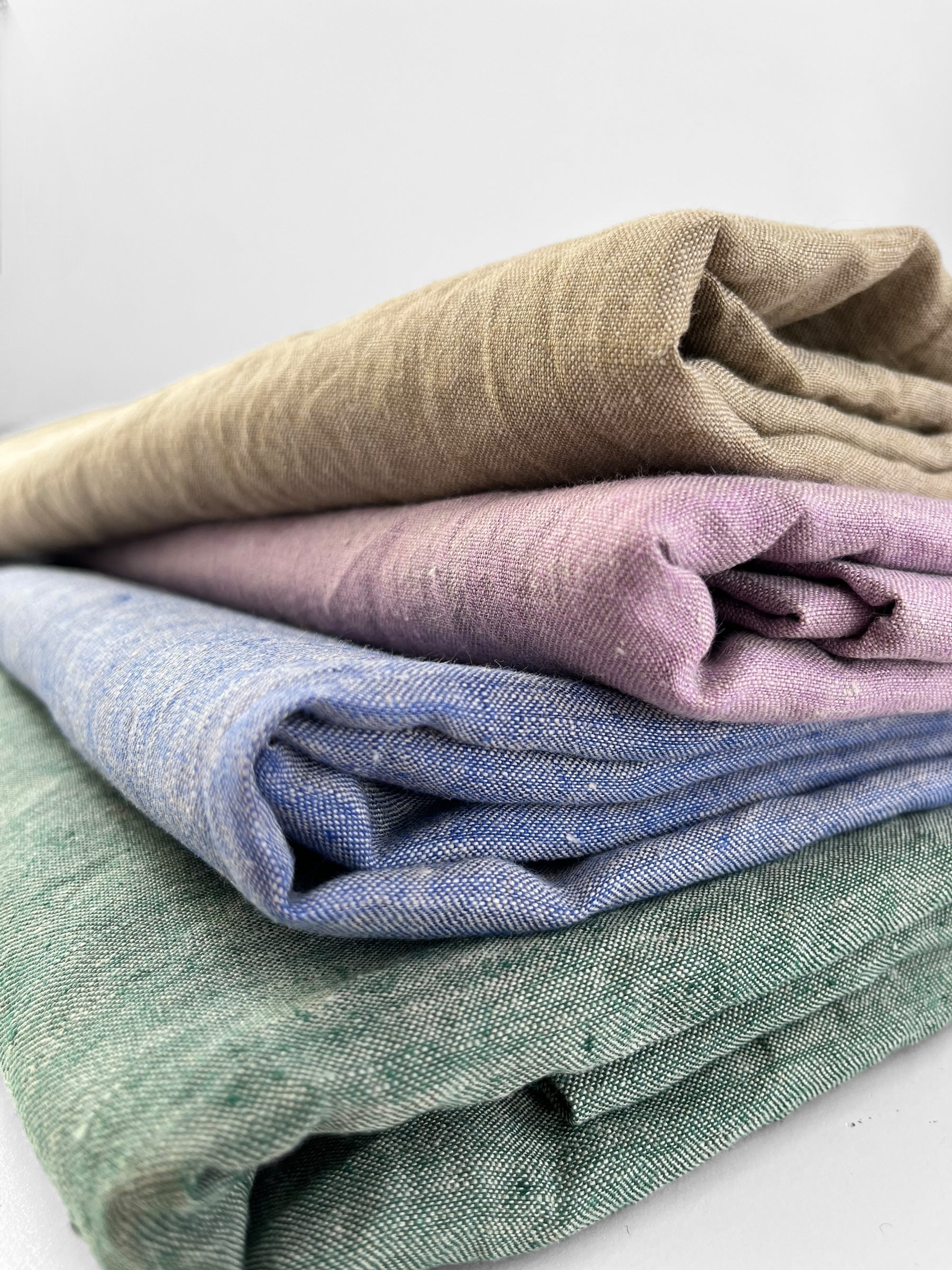 Premium quality linen/hemp blend woven out of two coloured yarn creating a unique melange look. Colours include lilac purple and natural/off white.
