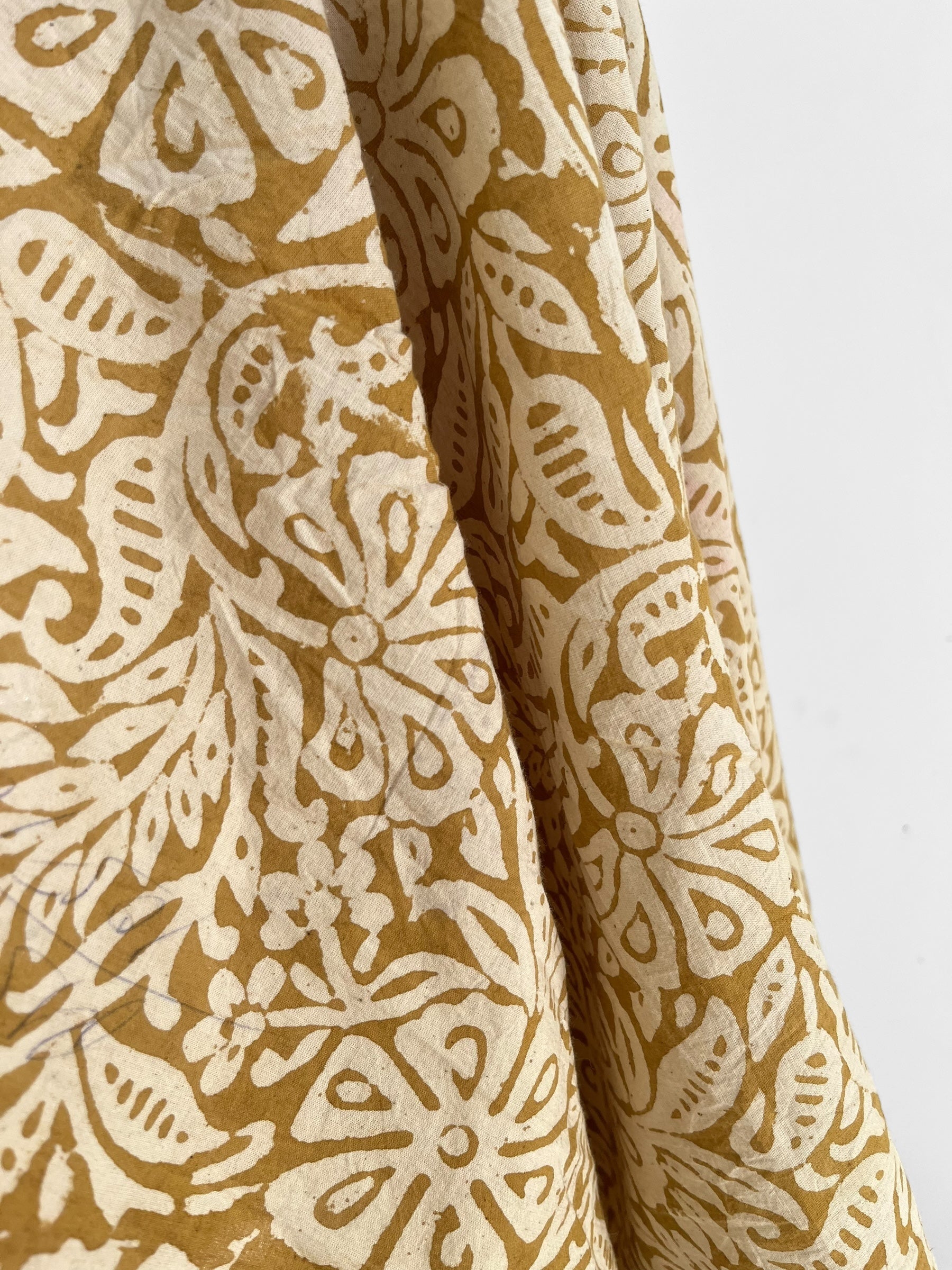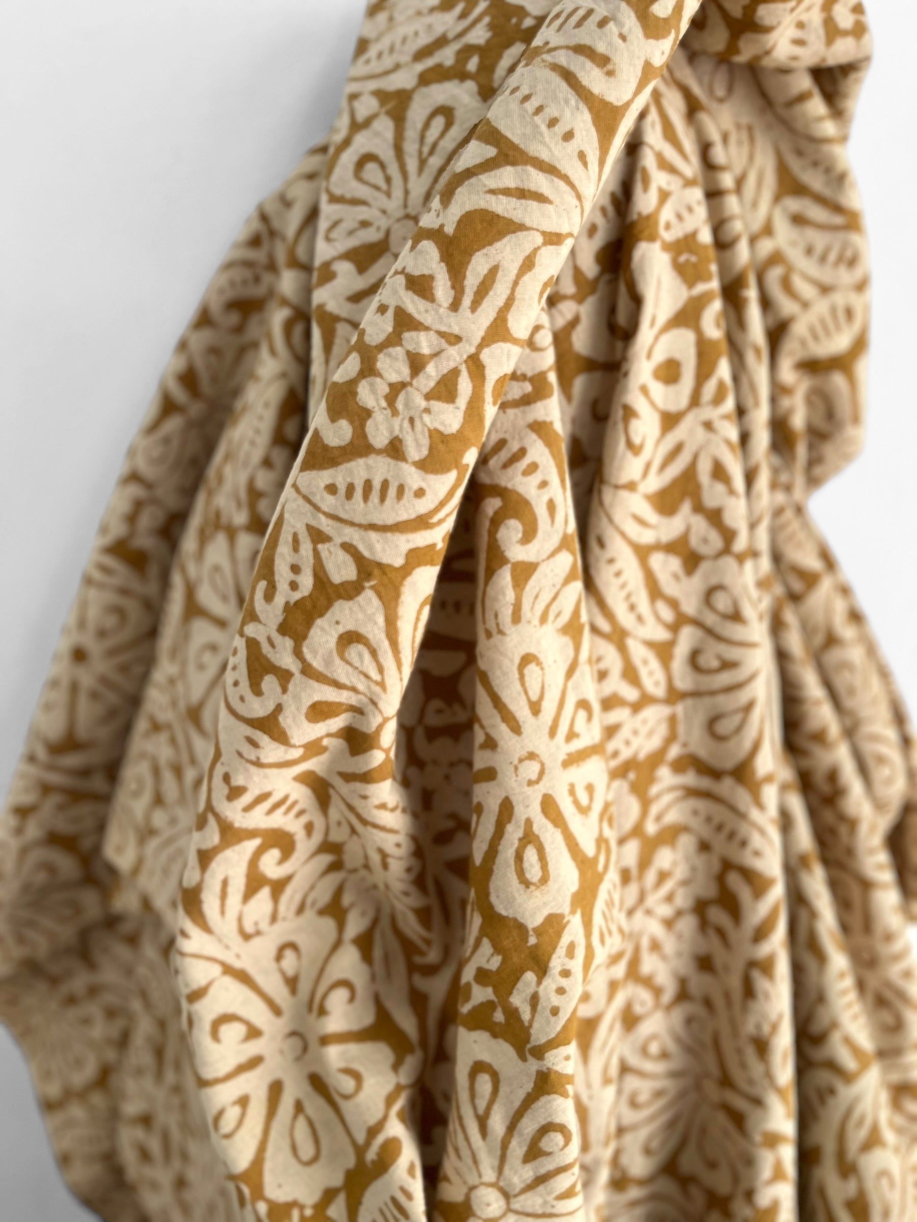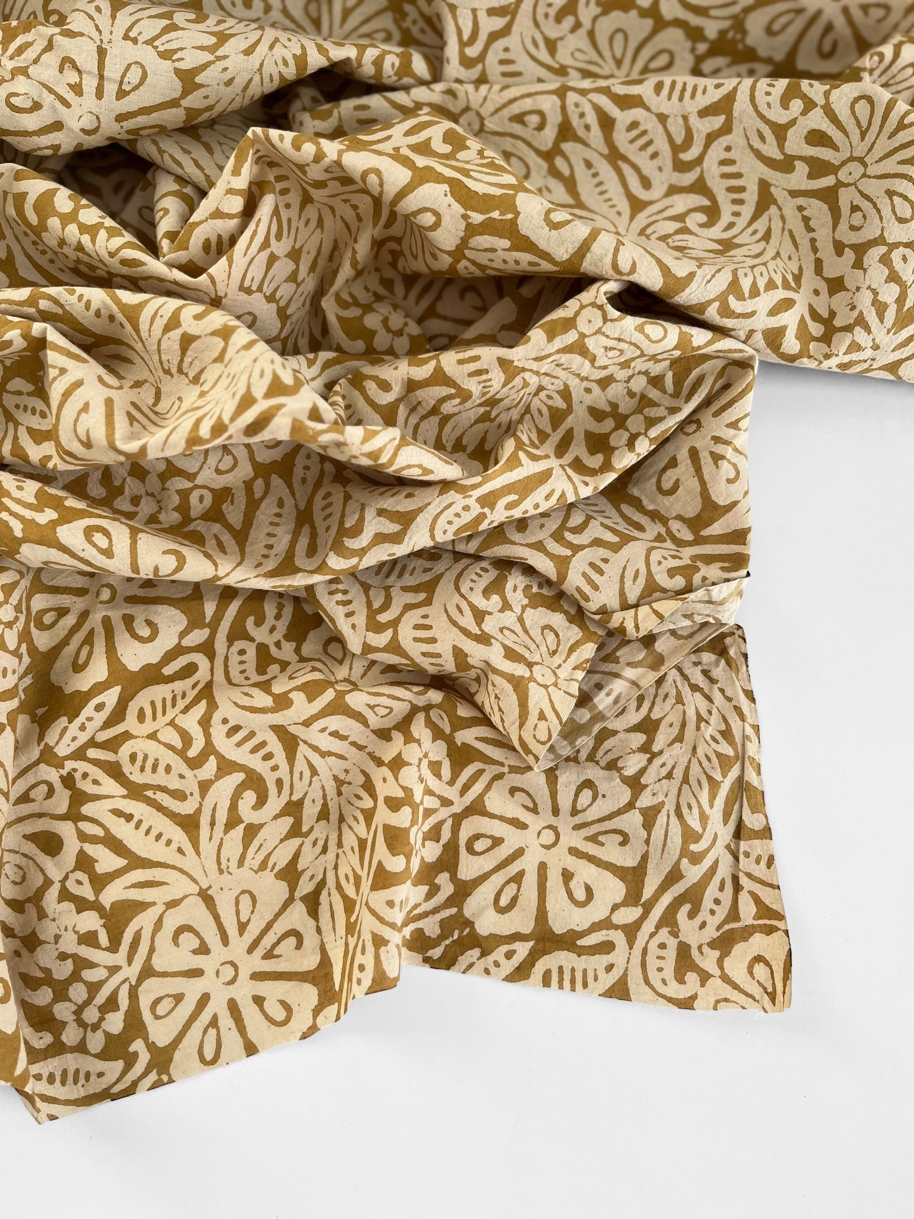 A traditional floral block print in mustard yellow and beige - handcrafted by artisans in Jaipur, India, utilising traditional processes and natural colours.