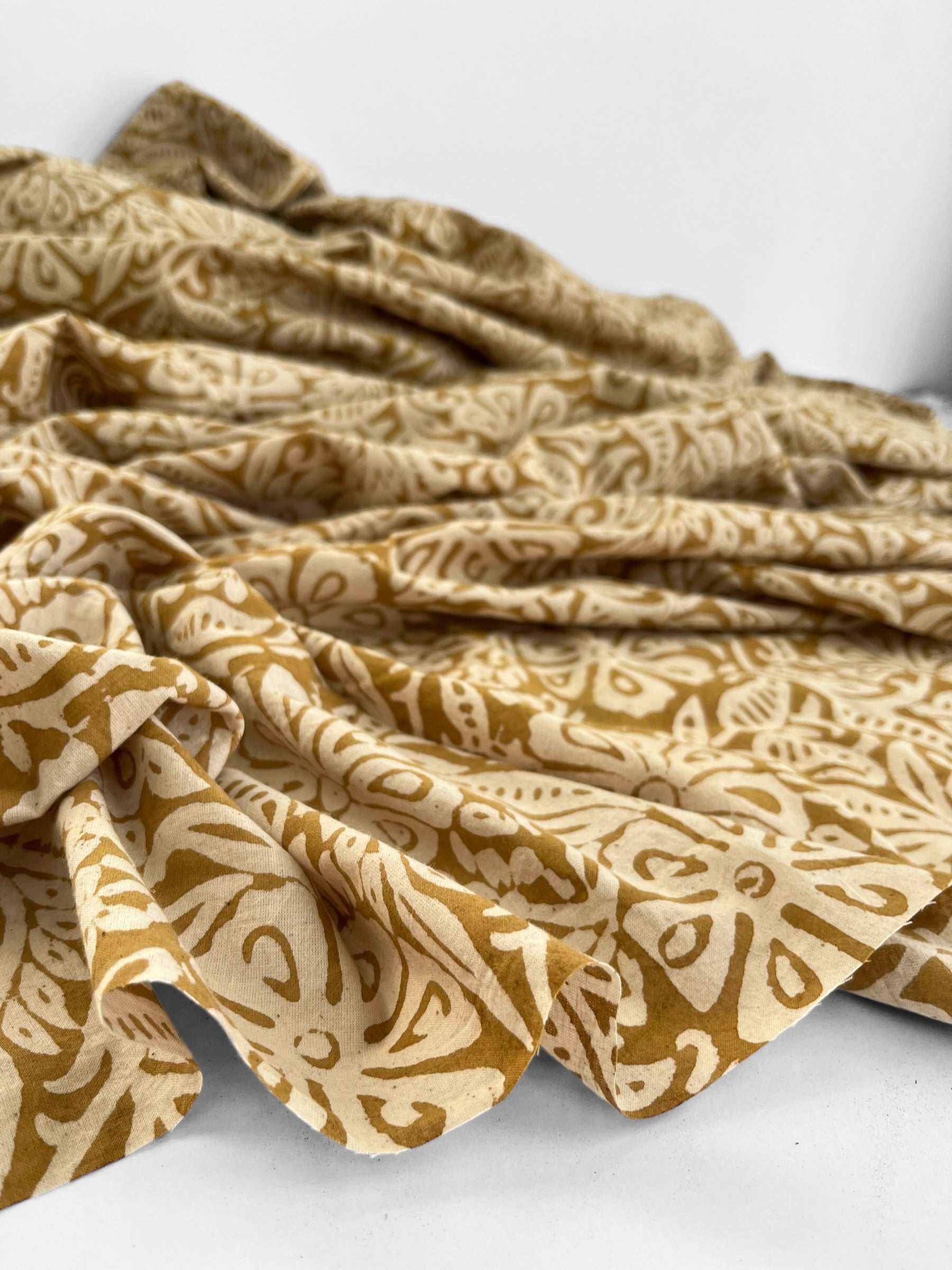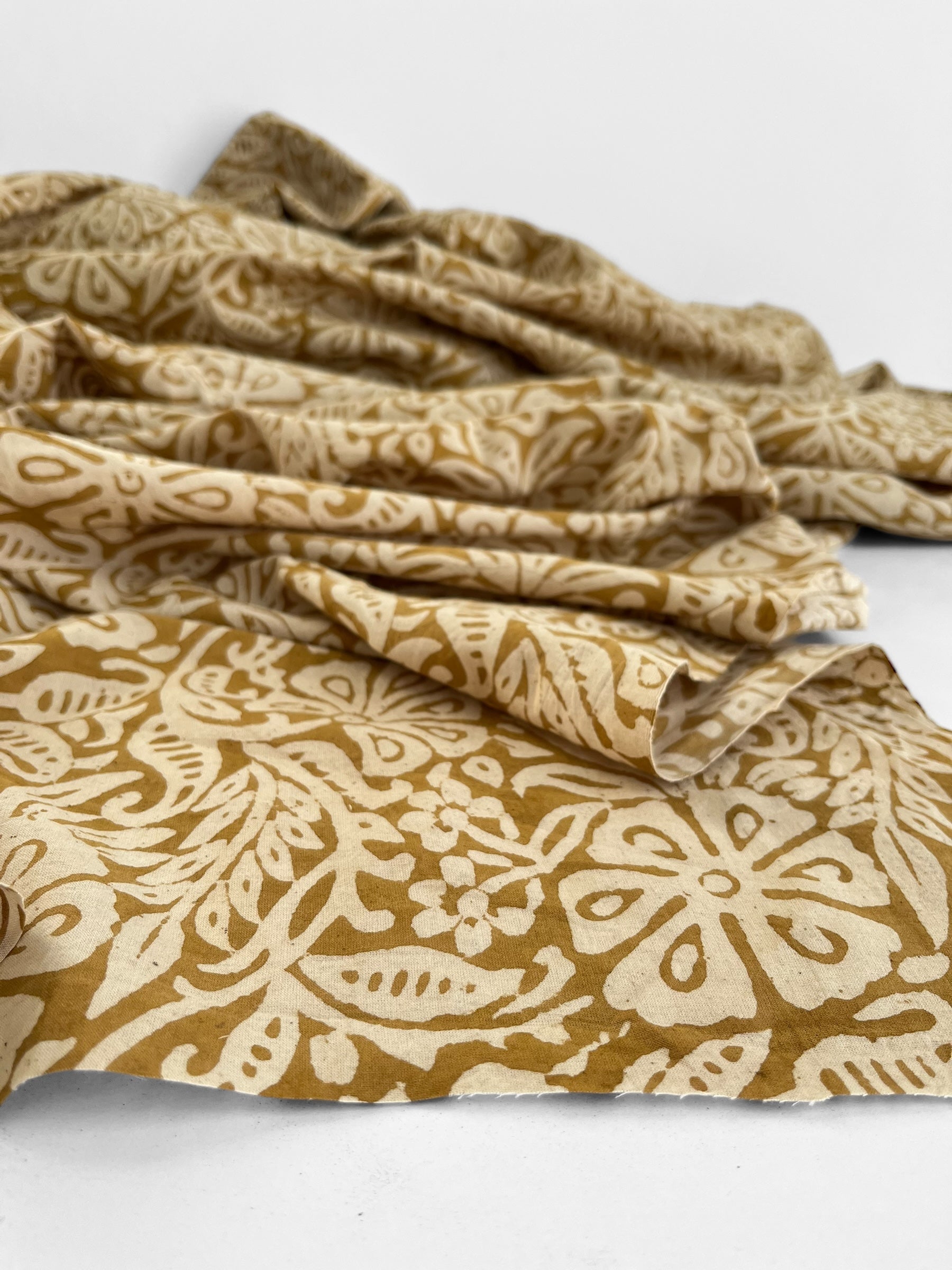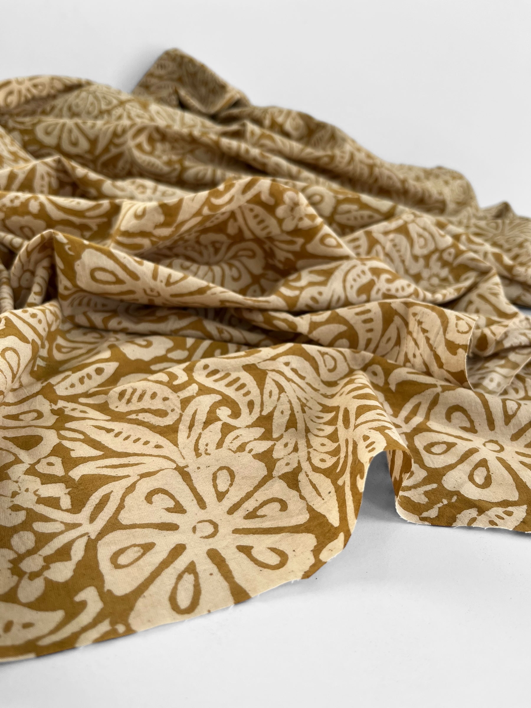 A traditional floral block print in mustard yellow and beige - handcrafted by artisans in Jaipur, India, utilising traditional processes and natural colours.