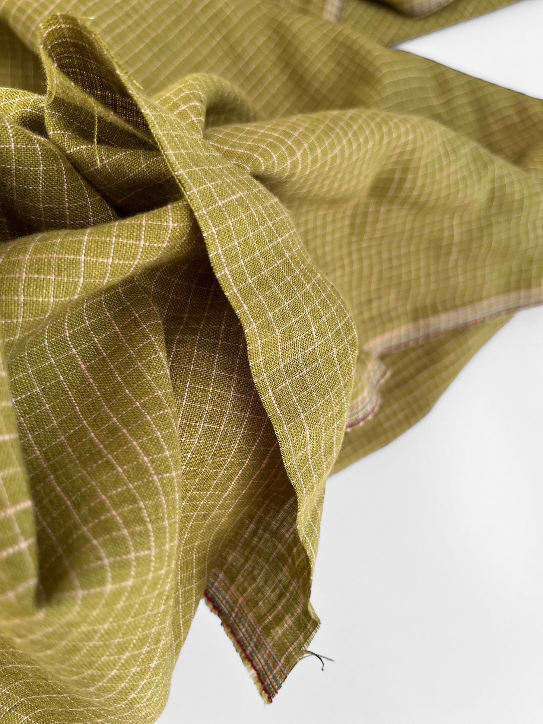 Beautifully soft linen/cotton blend in a vibrant moss green colour with lilac yarn running through to create a subtle grid
