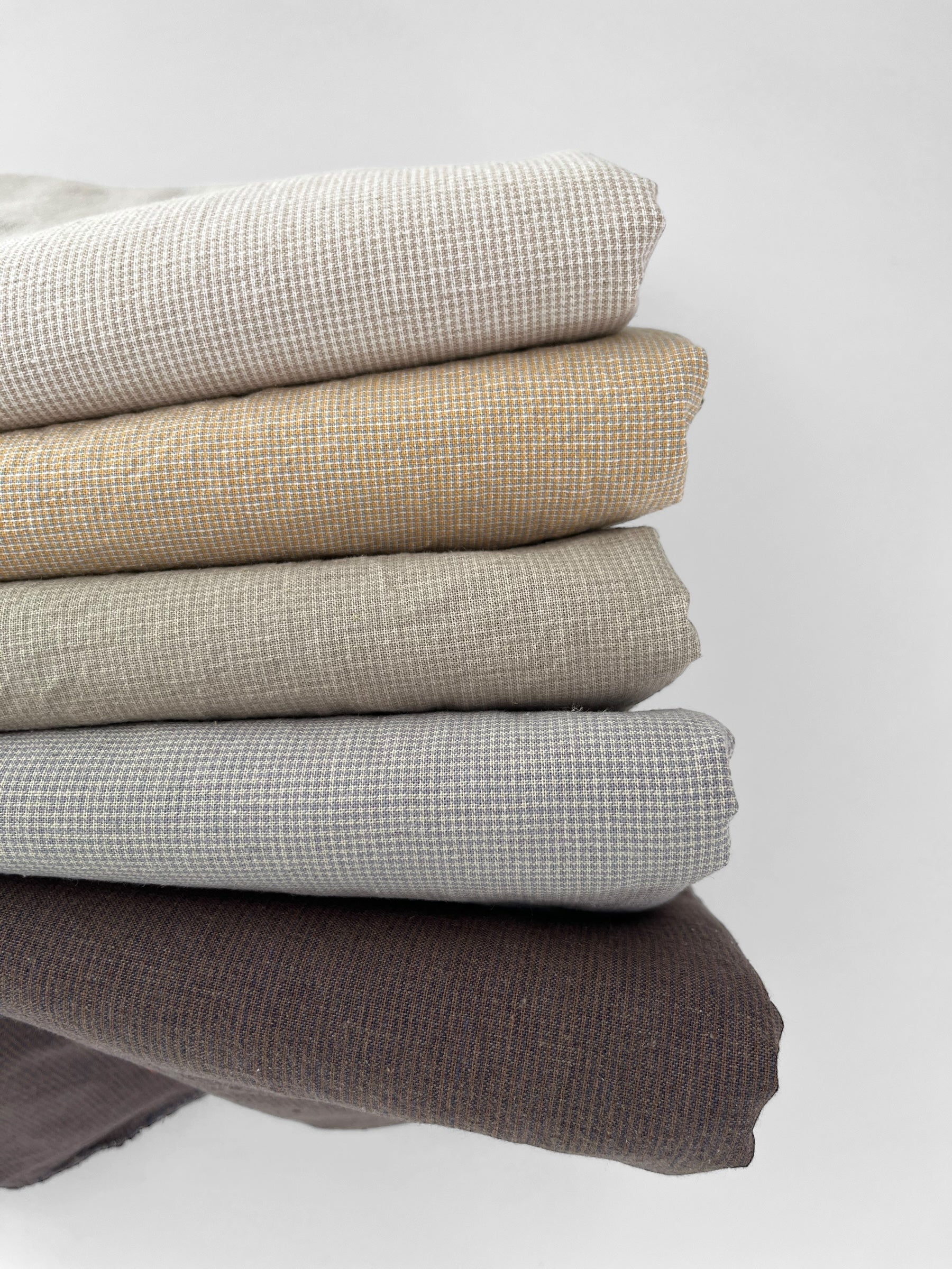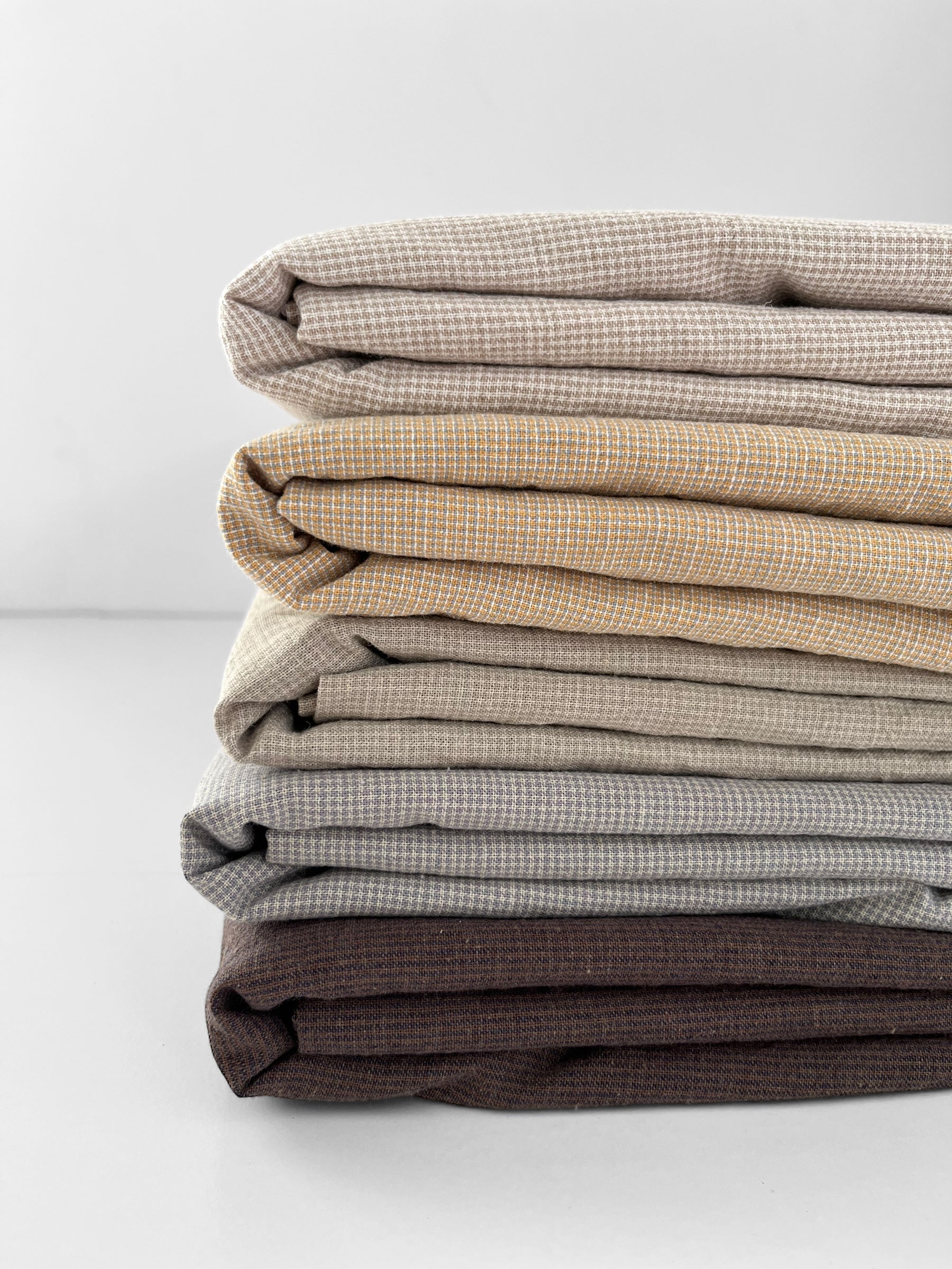 Beautifully soft yarn dyed cotton/linen blend in a classic micro checks pattern. The mud colourway includes chocolate brown and navy.