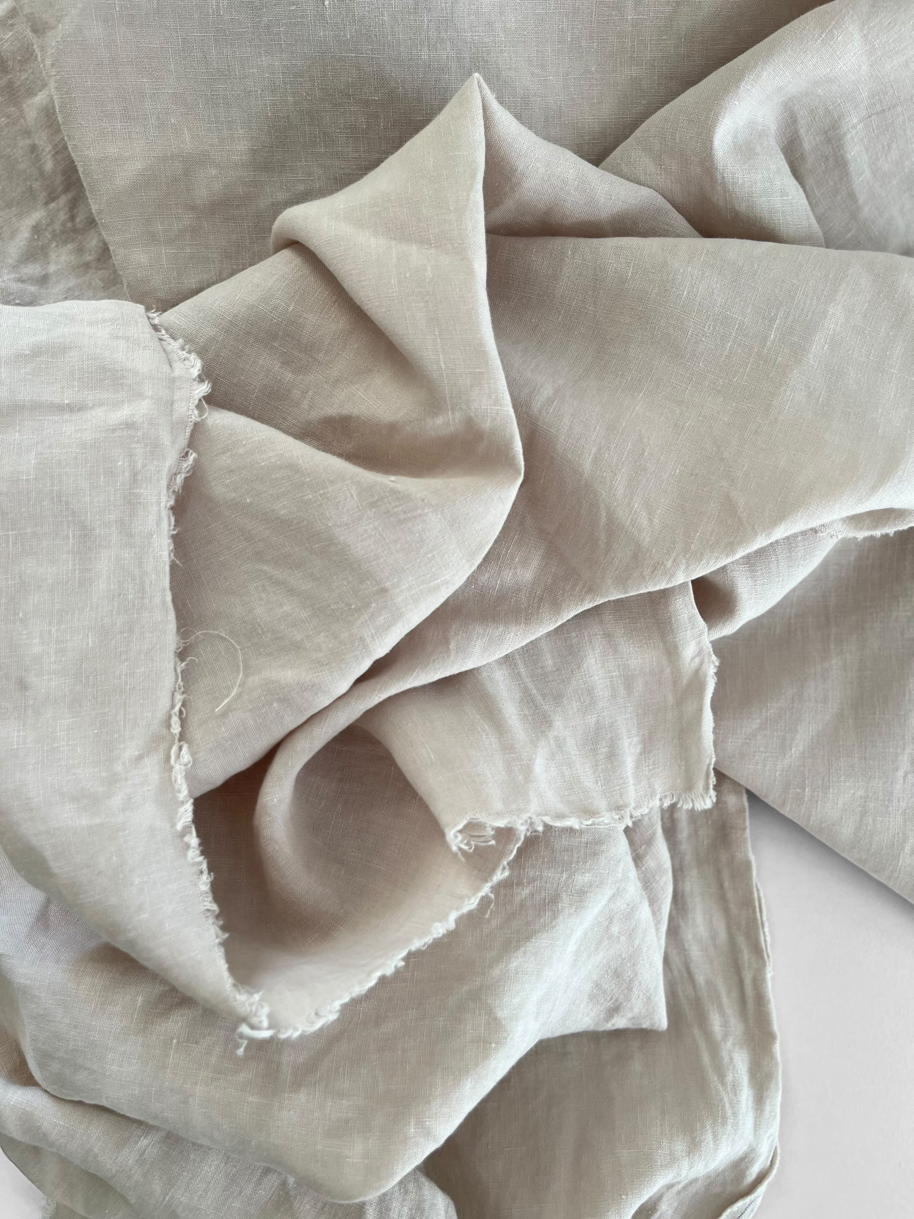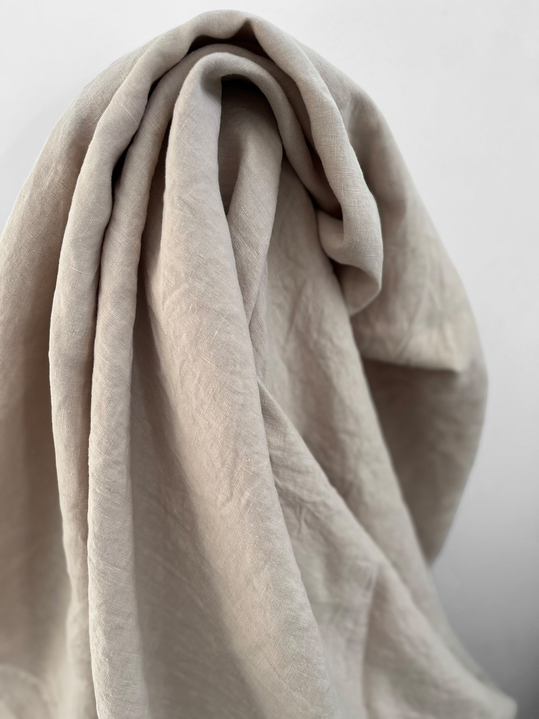 Wash at 30 degrees with a mild bleach-free detergent. Do not tumble dry. Shake out and dry flat. Both linen and hemp will always seize up after washing but as soon as you start to use/wear it the fibres relax again.