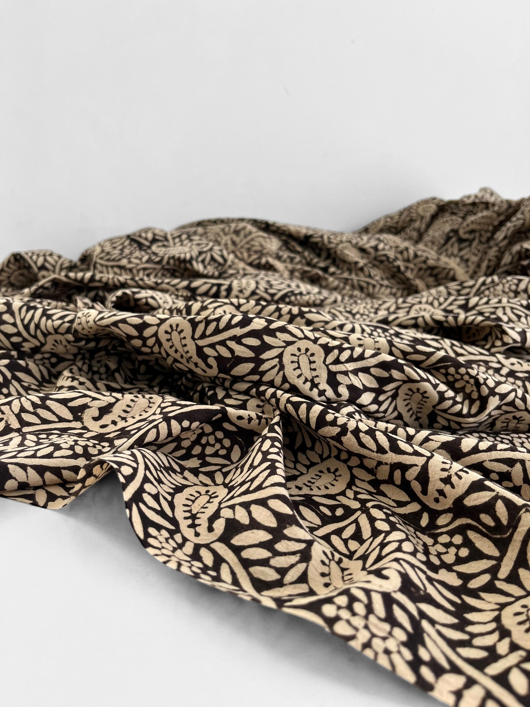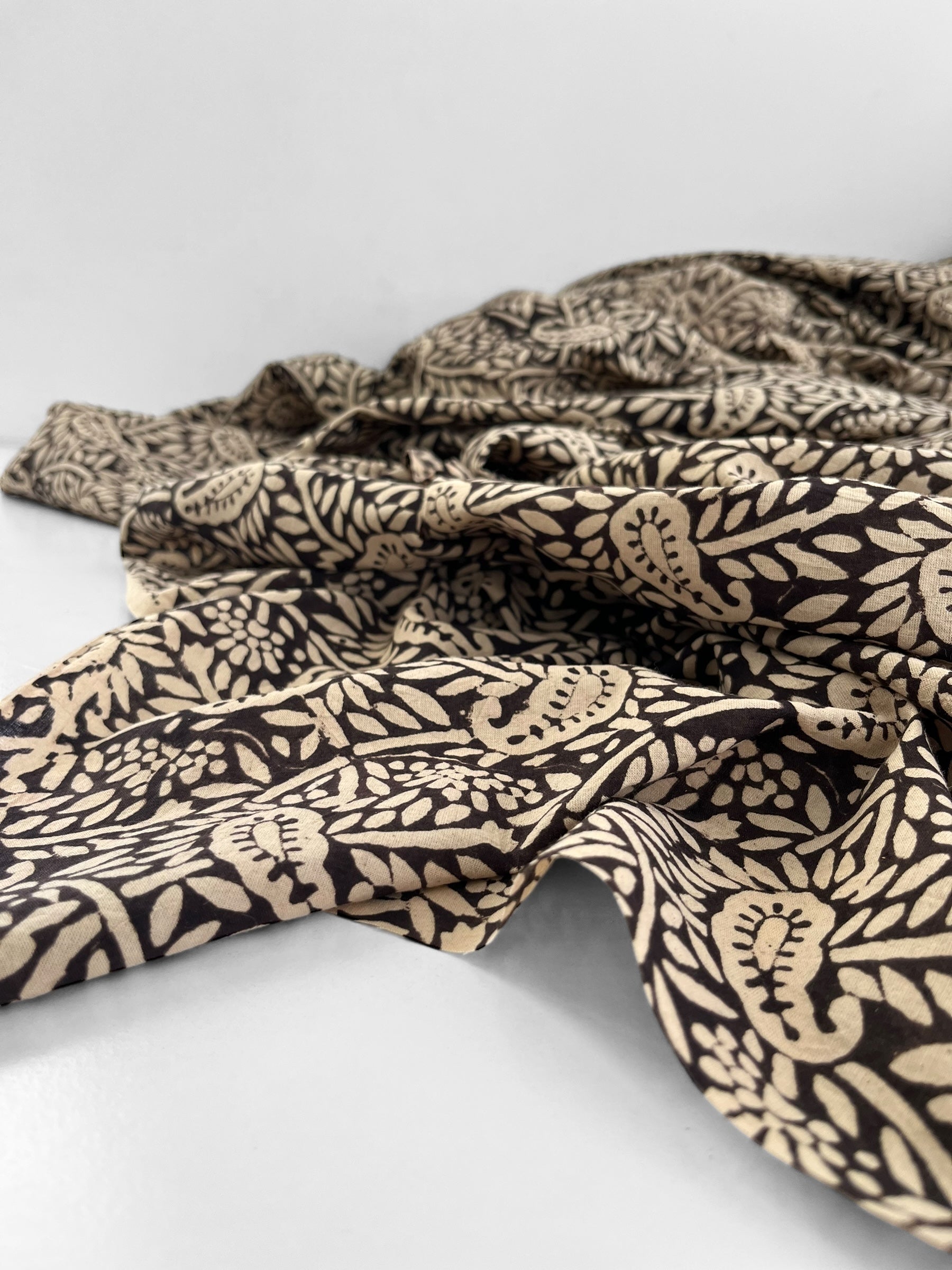 A monochrome paisley block print in black and beige - handcrafted by artisans in Jaipur, India, utilising traditional processes and natural colours.