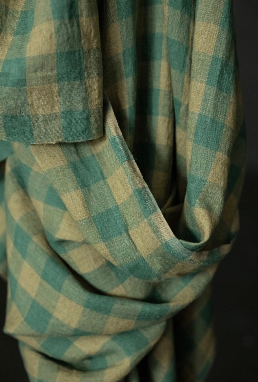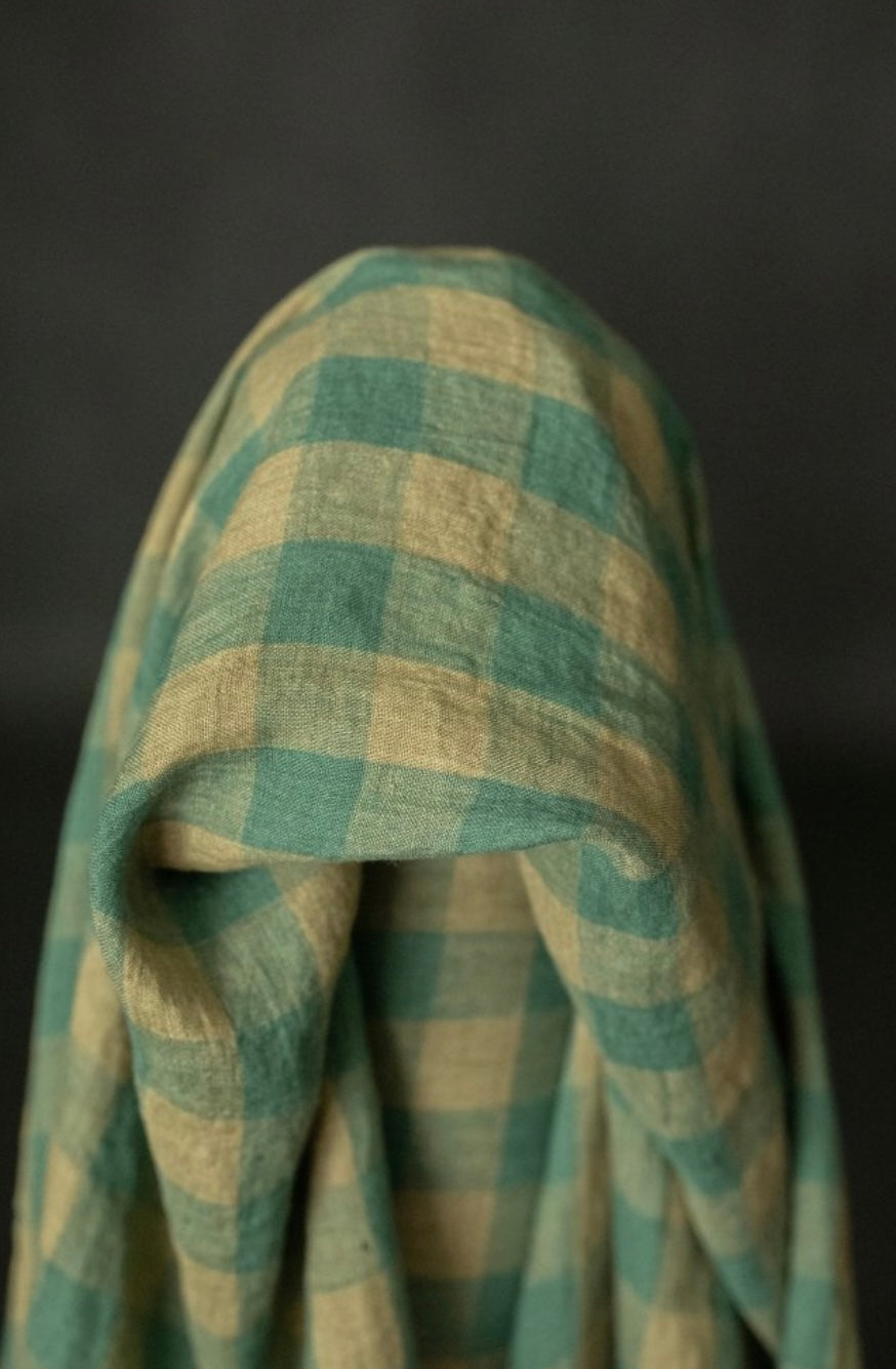 It features a subtle tonal green gingham pattern.