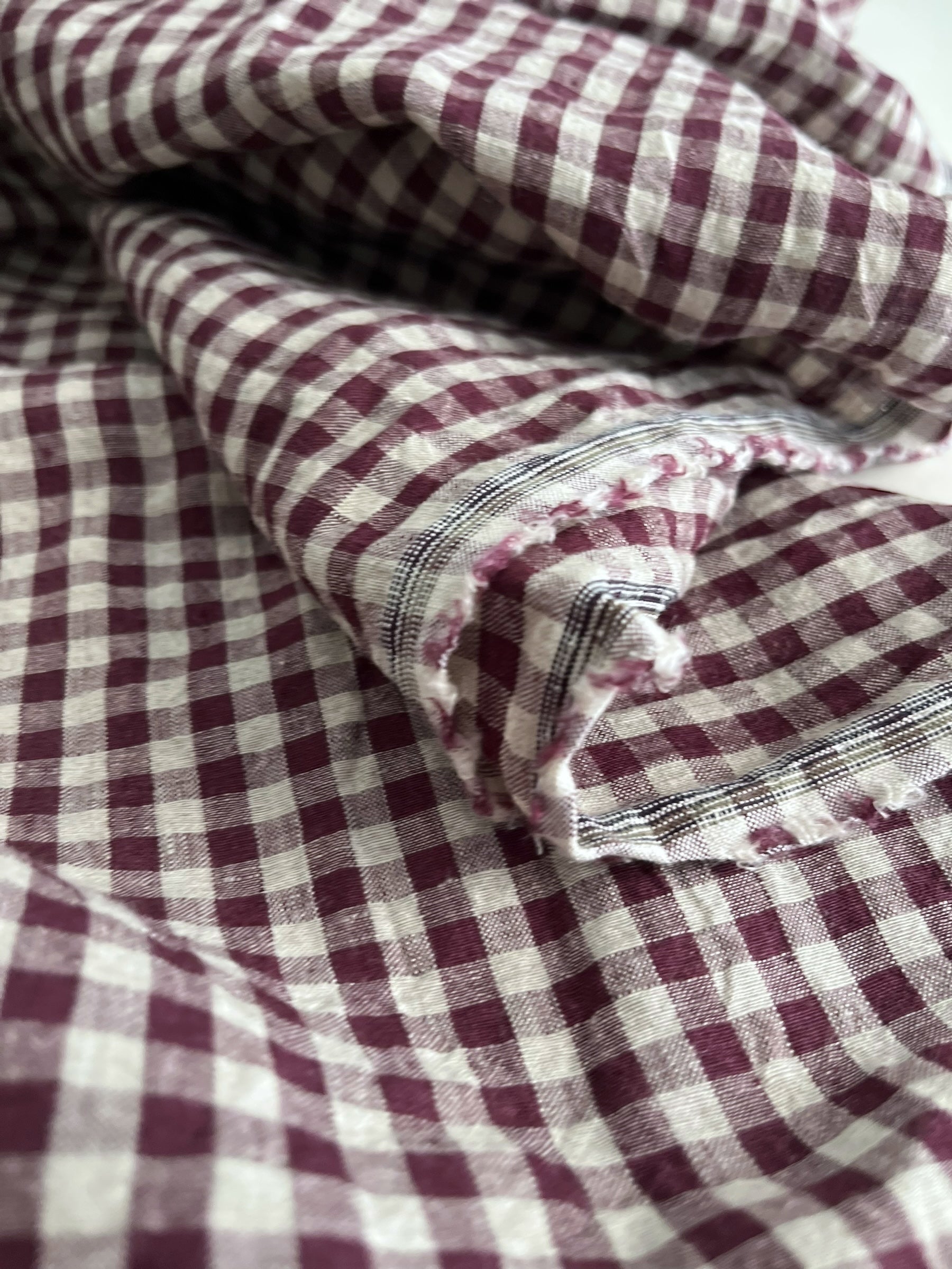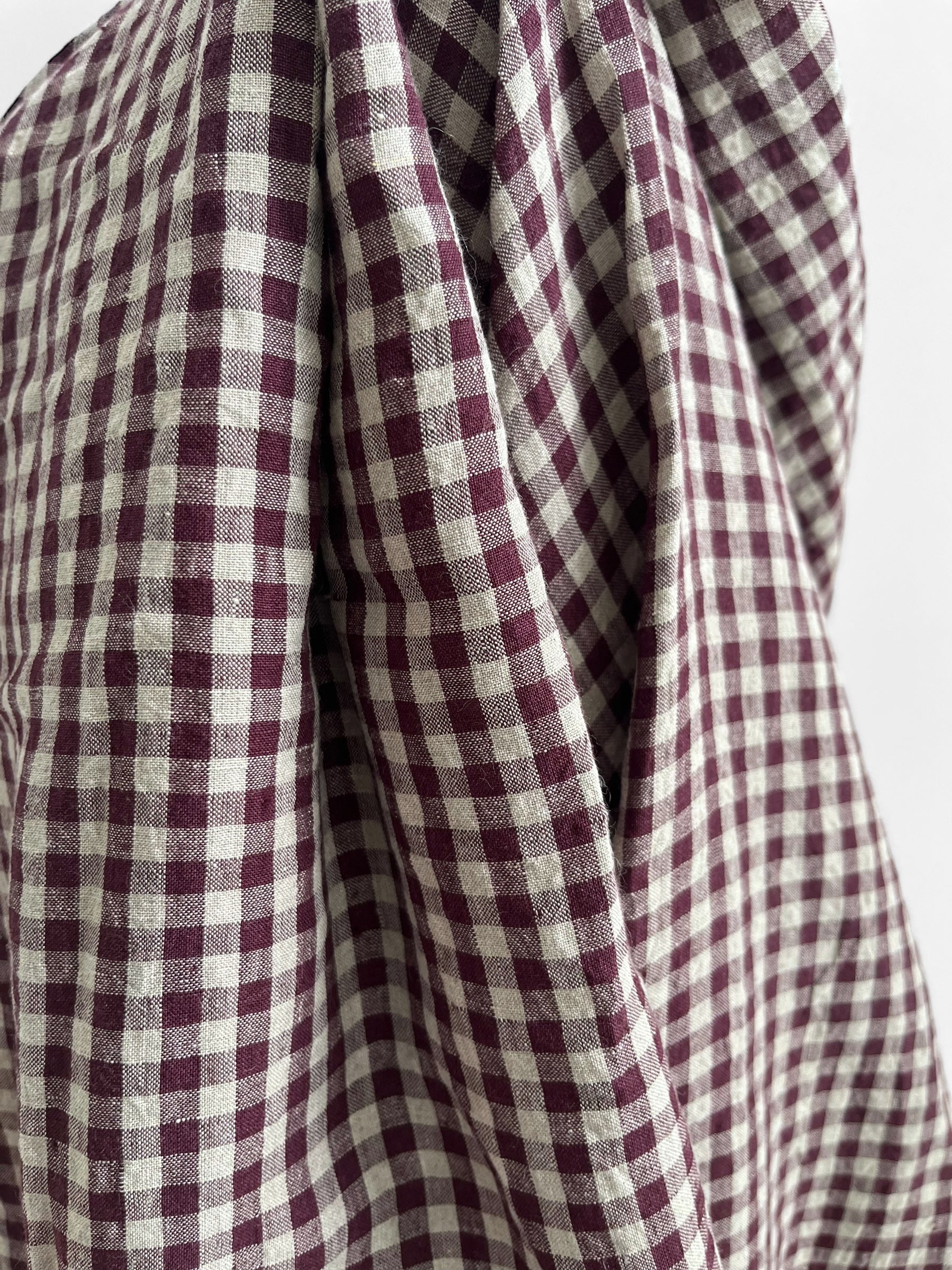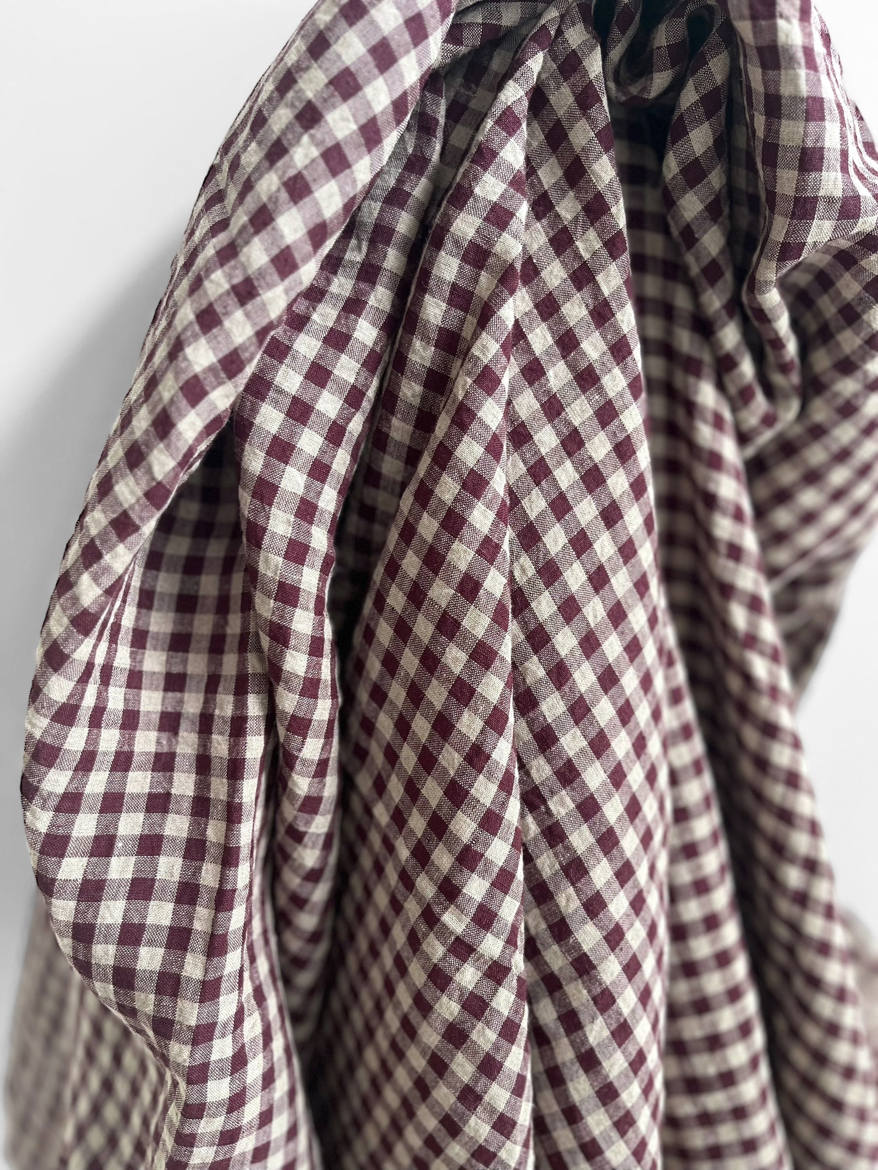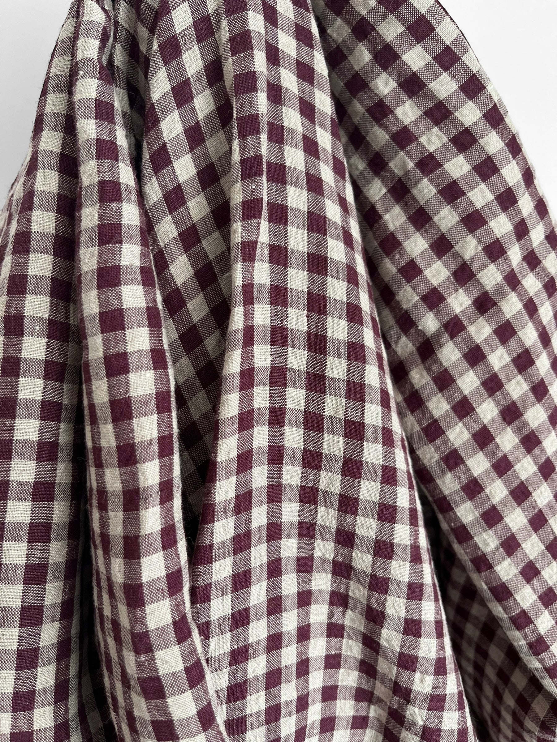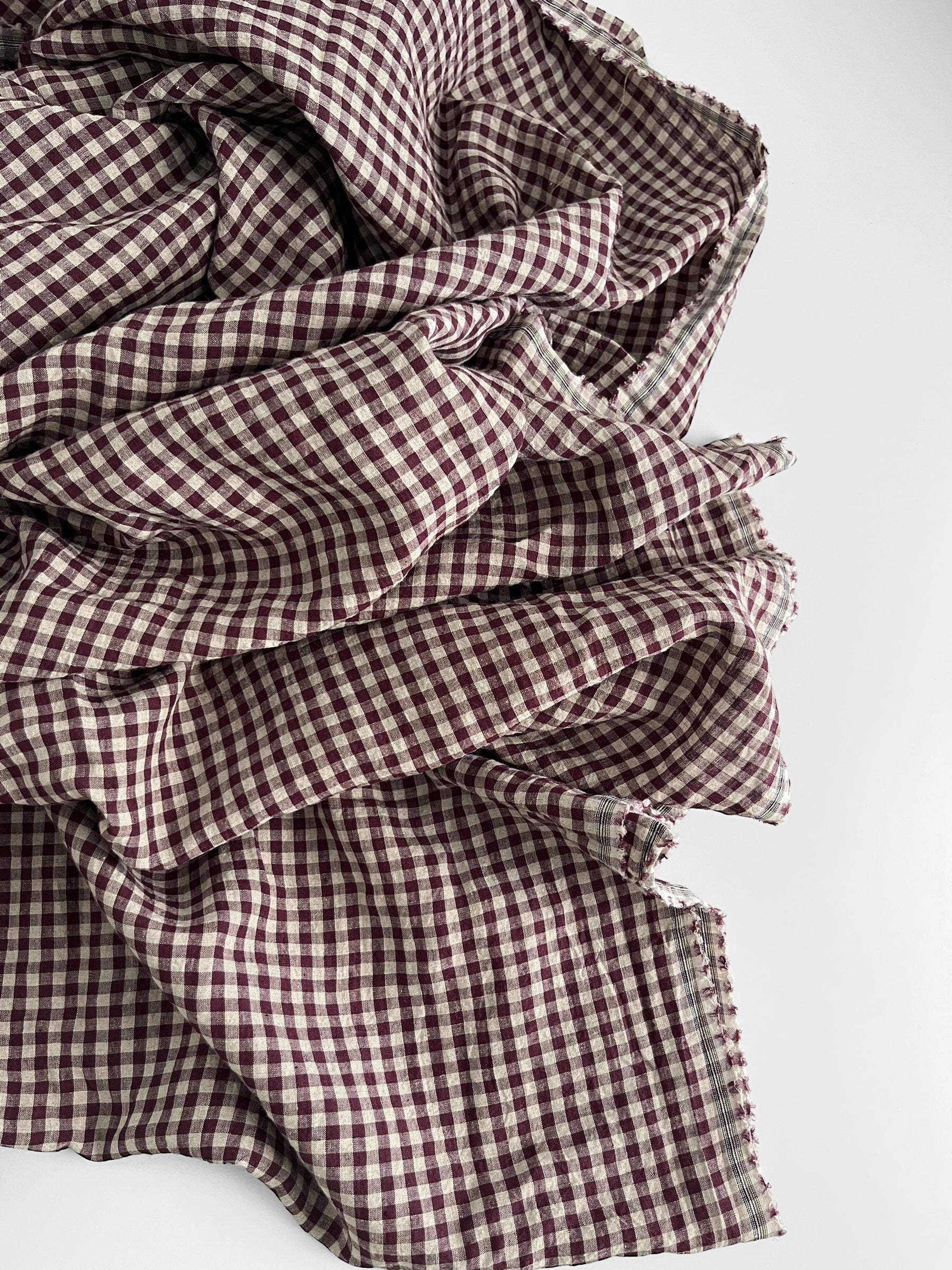 Premium quality 100% linen featuring a yarn dyed vintage gingham pattern. Colours include a plum purple and natural flax.