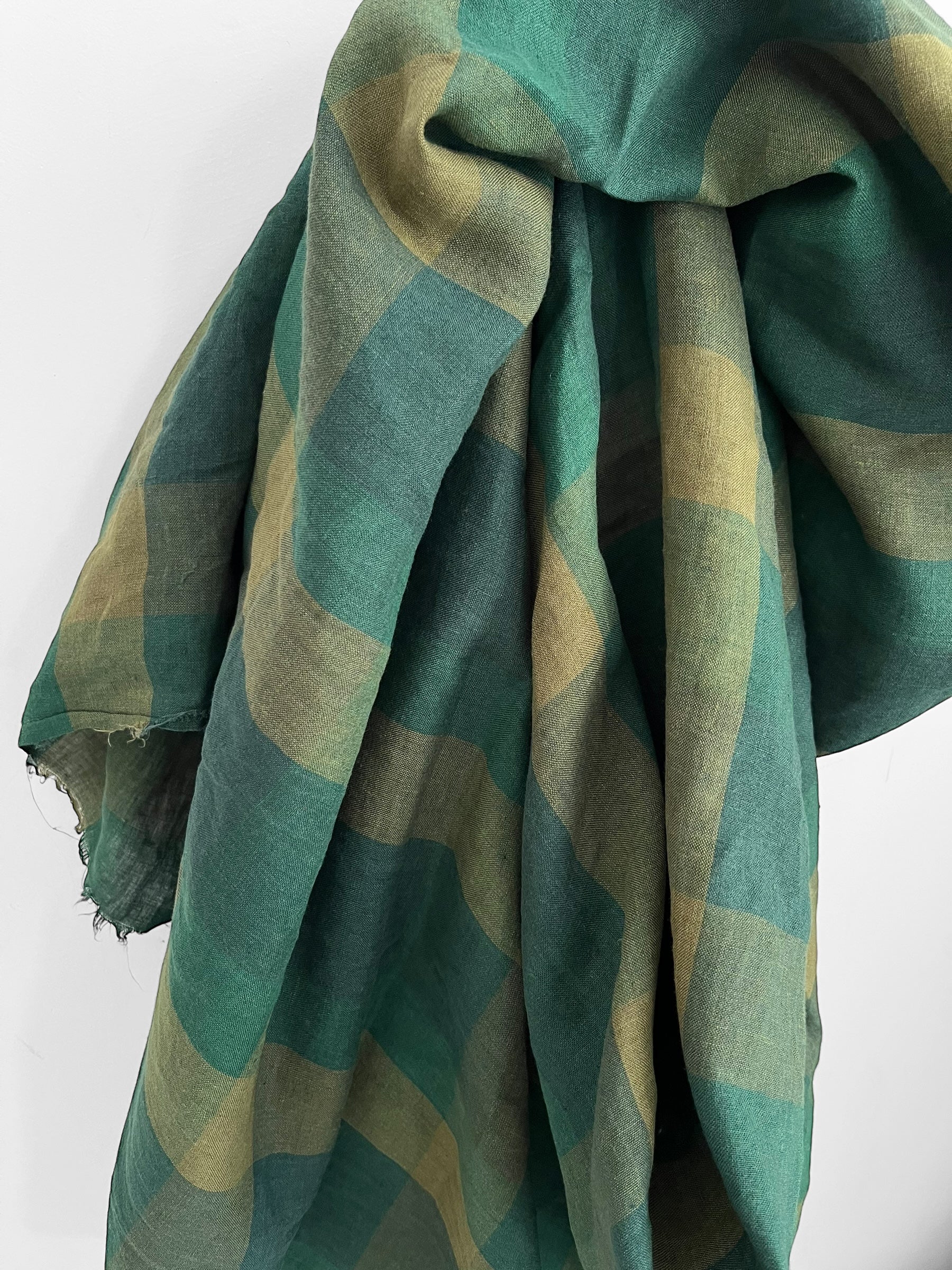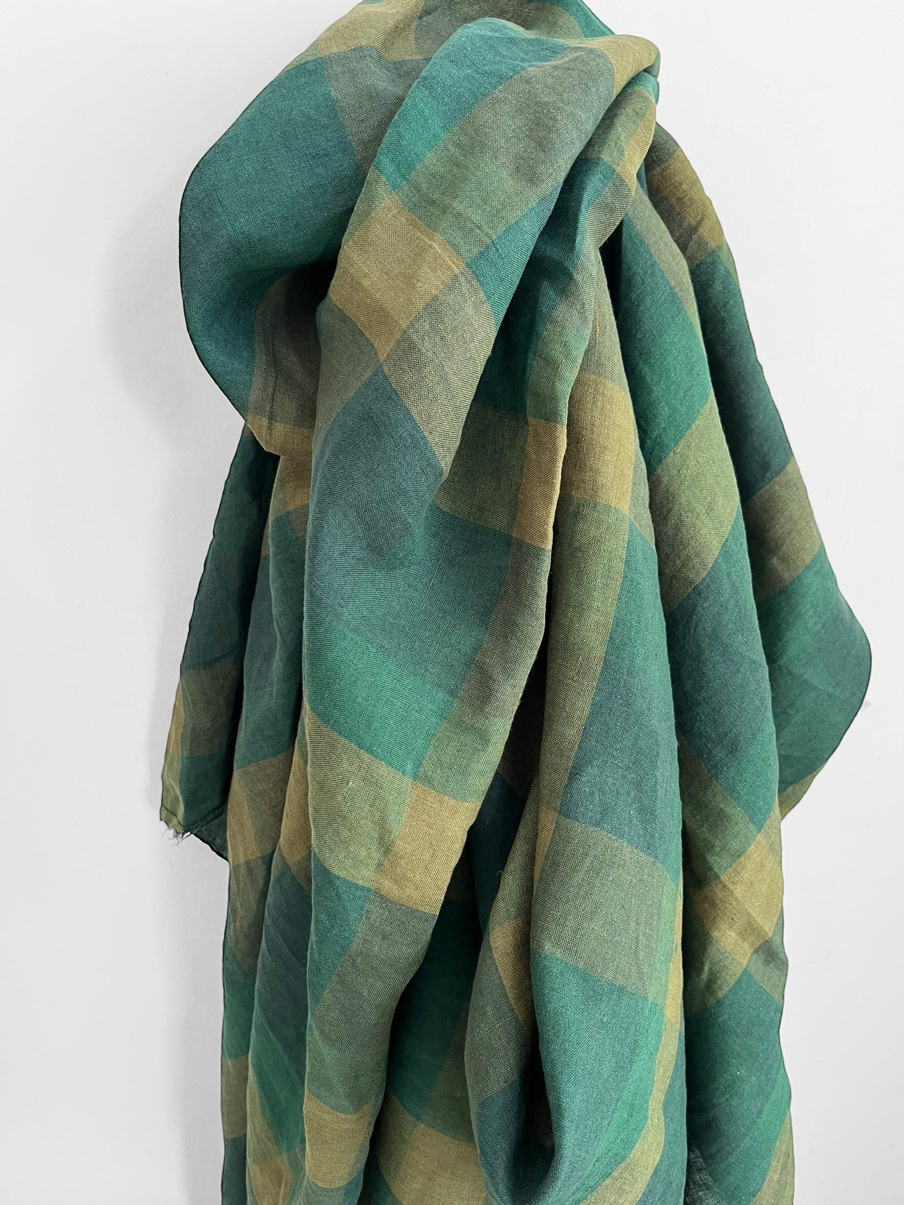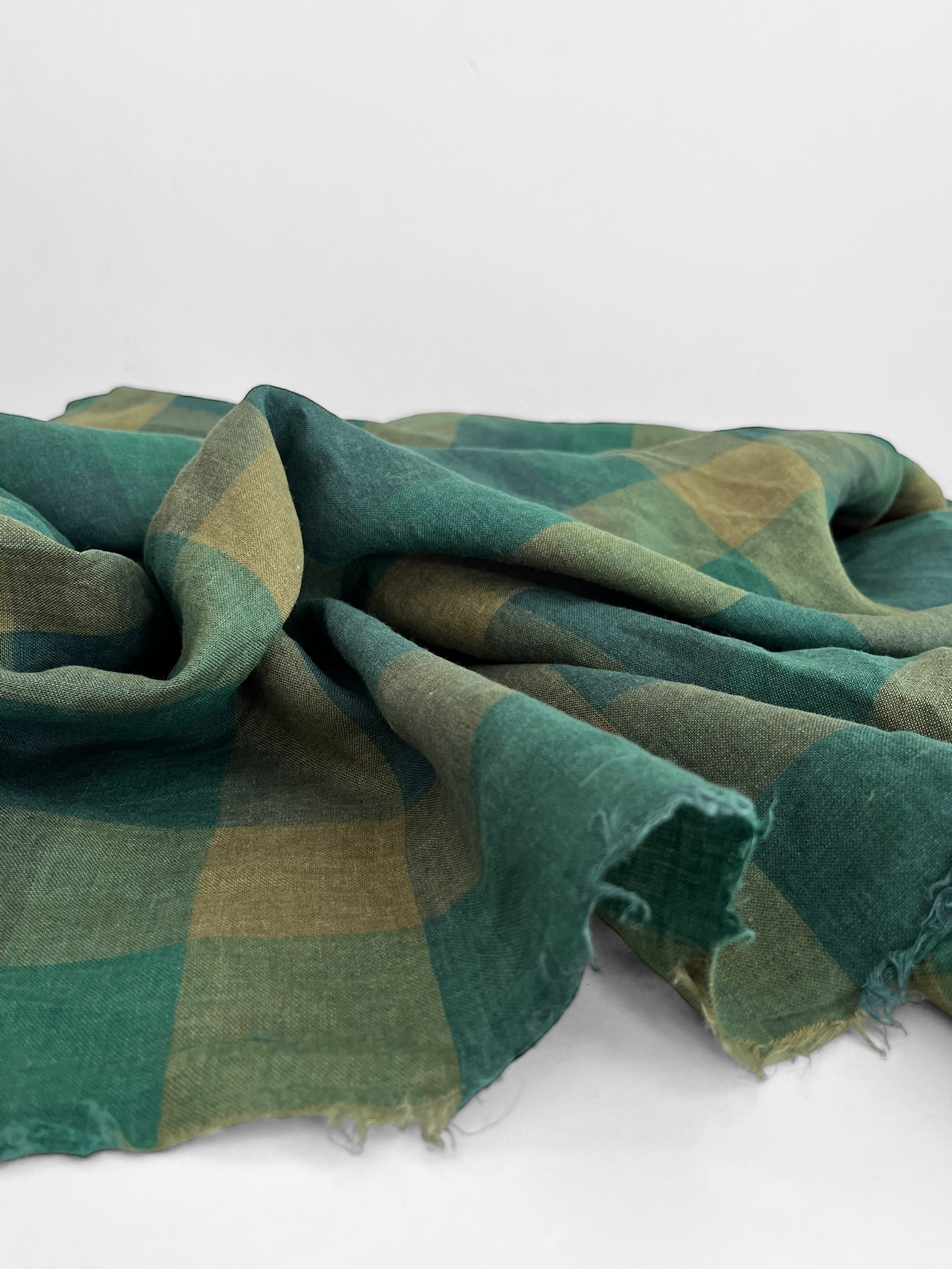 Light weight yarn dyed linen in a timeless tonal green checks pattern.