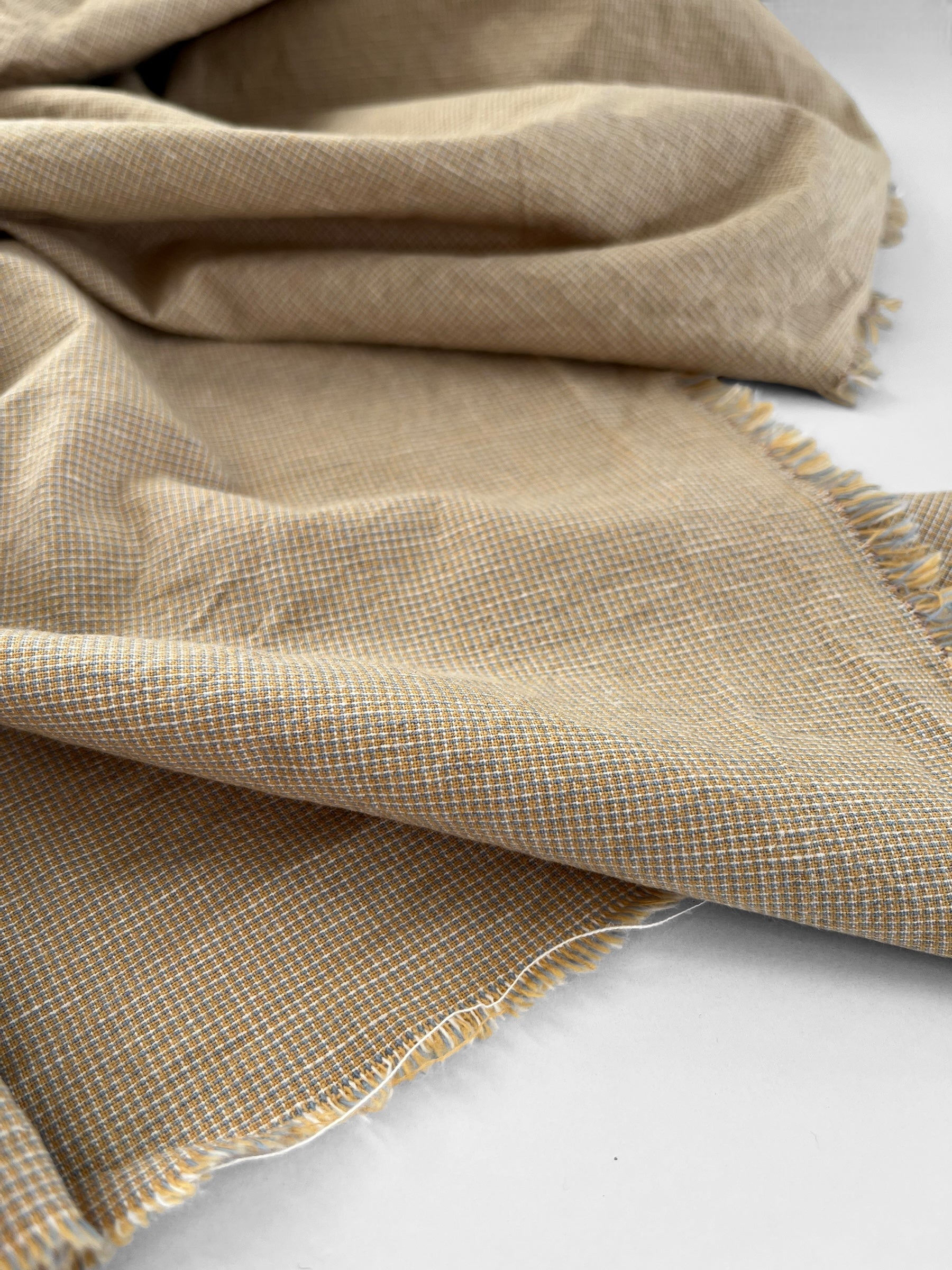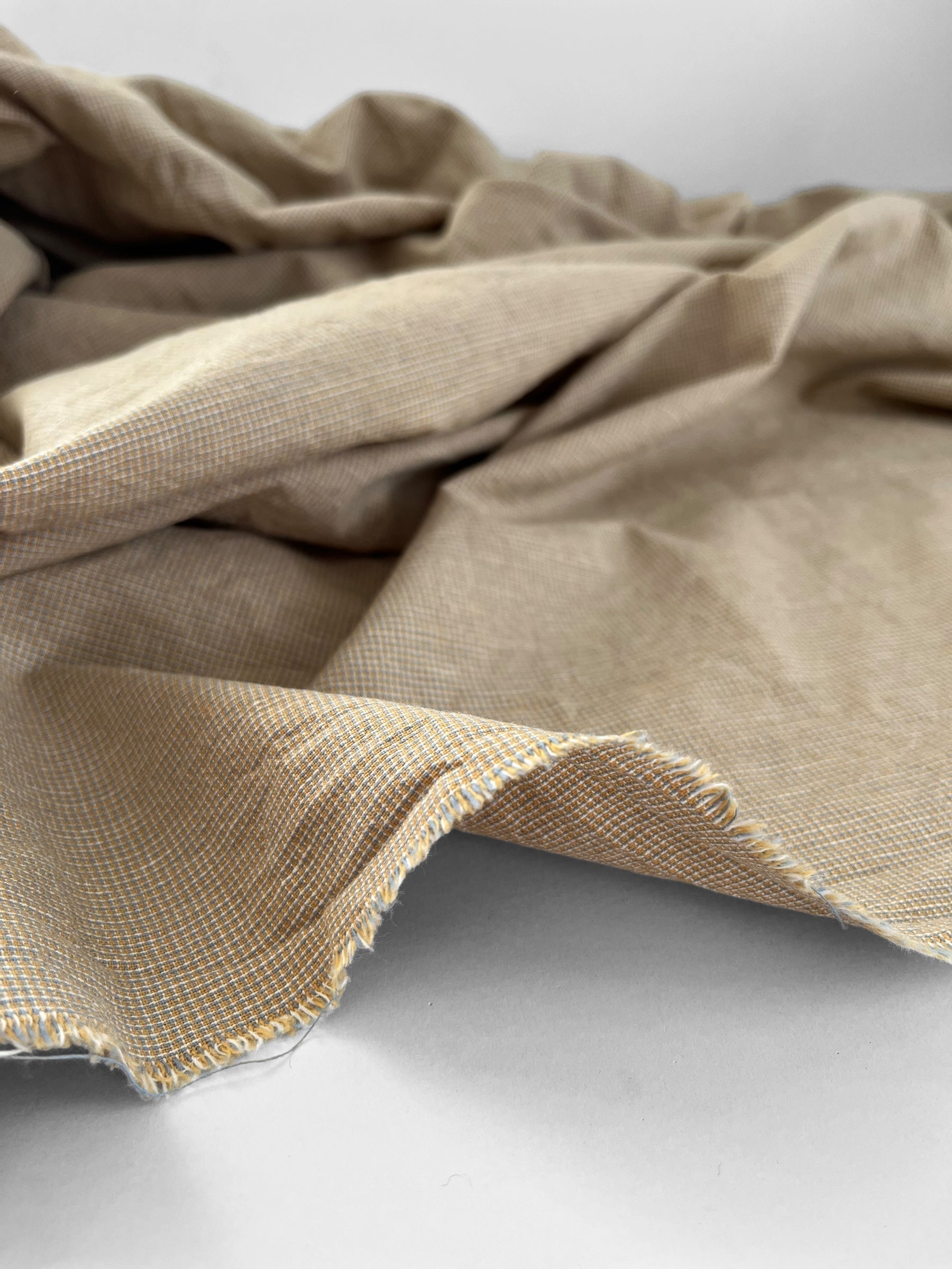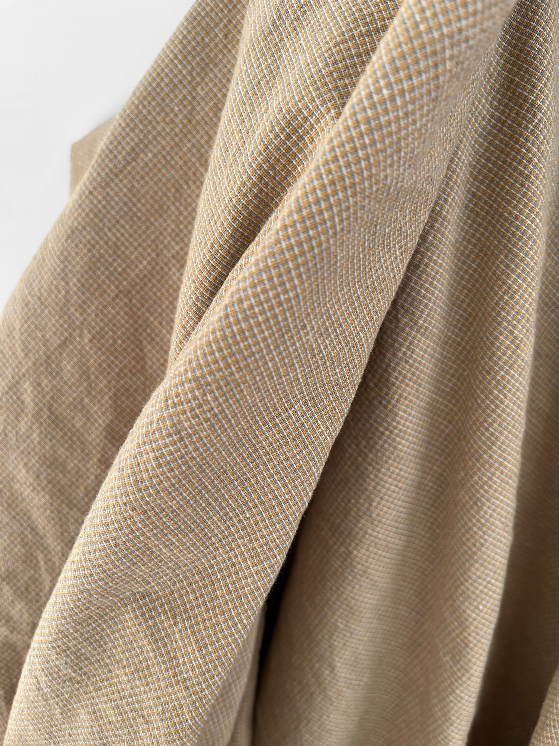 Beautifully soft yarn dyed cotton/linen blend in a classic micro checks pattern. The sand colourway includes sandy yellow with touches of dove blue and white.