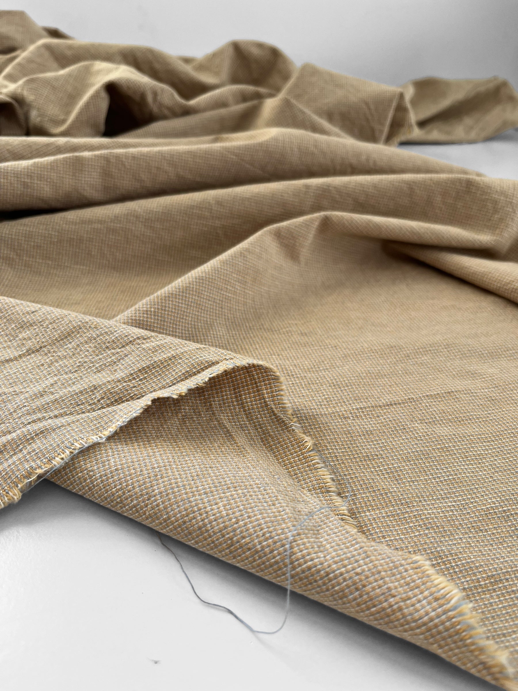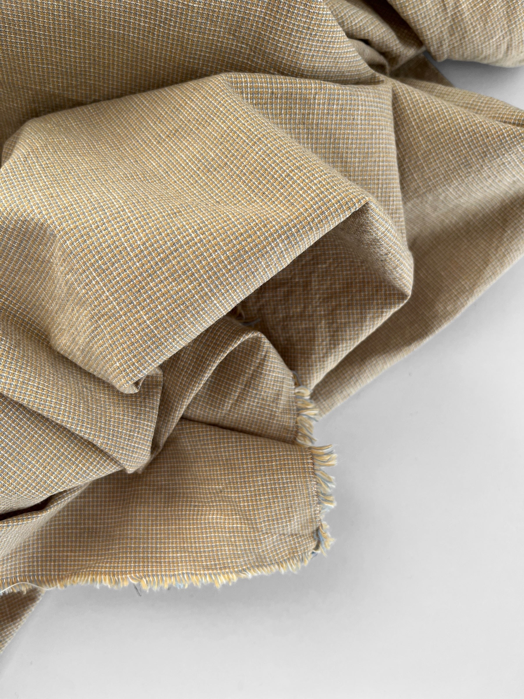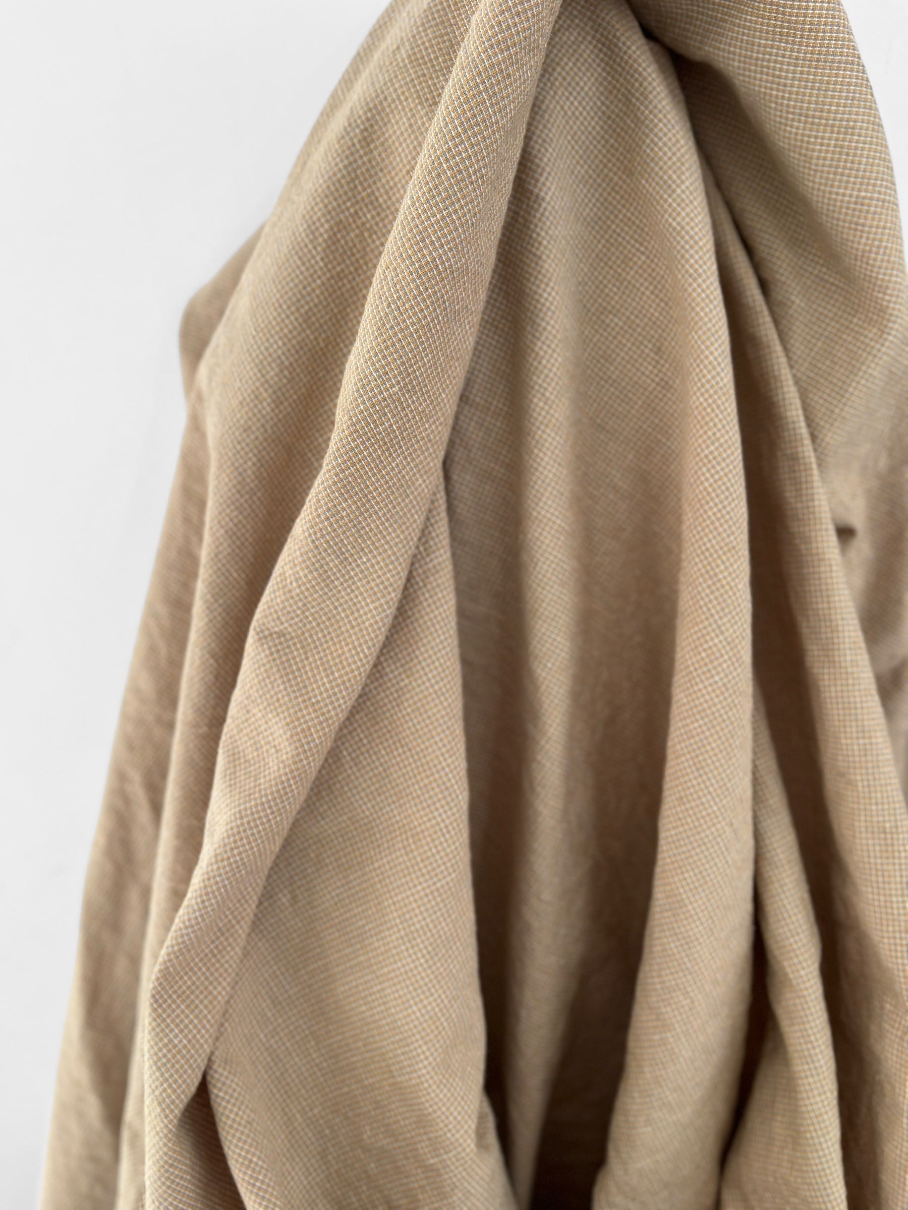 Beautifully soft yarn dyed cotton/linen blend in a classic micro checks pattern. The sand colourway includes sandy yellow with touches of dove blue and white.