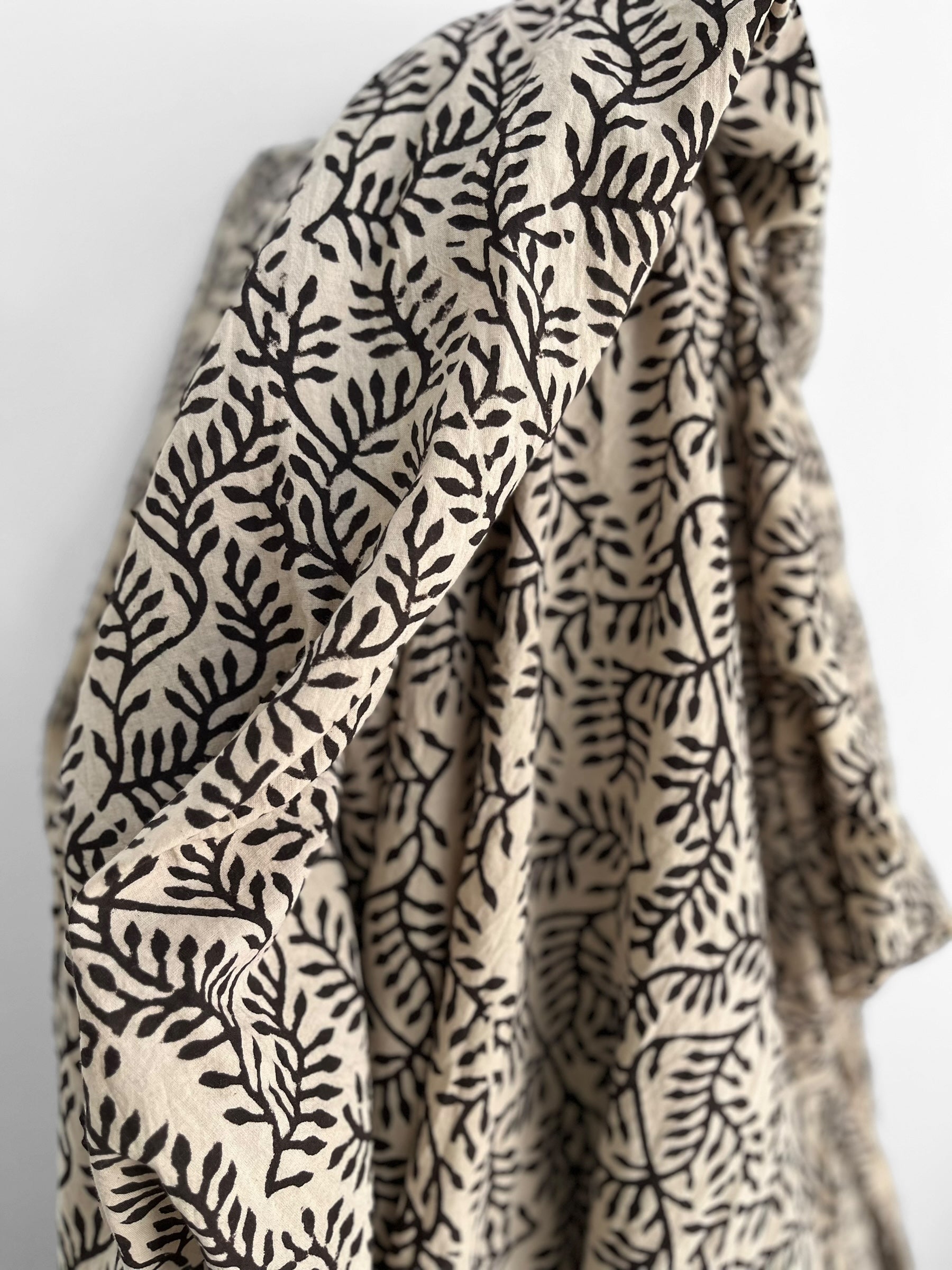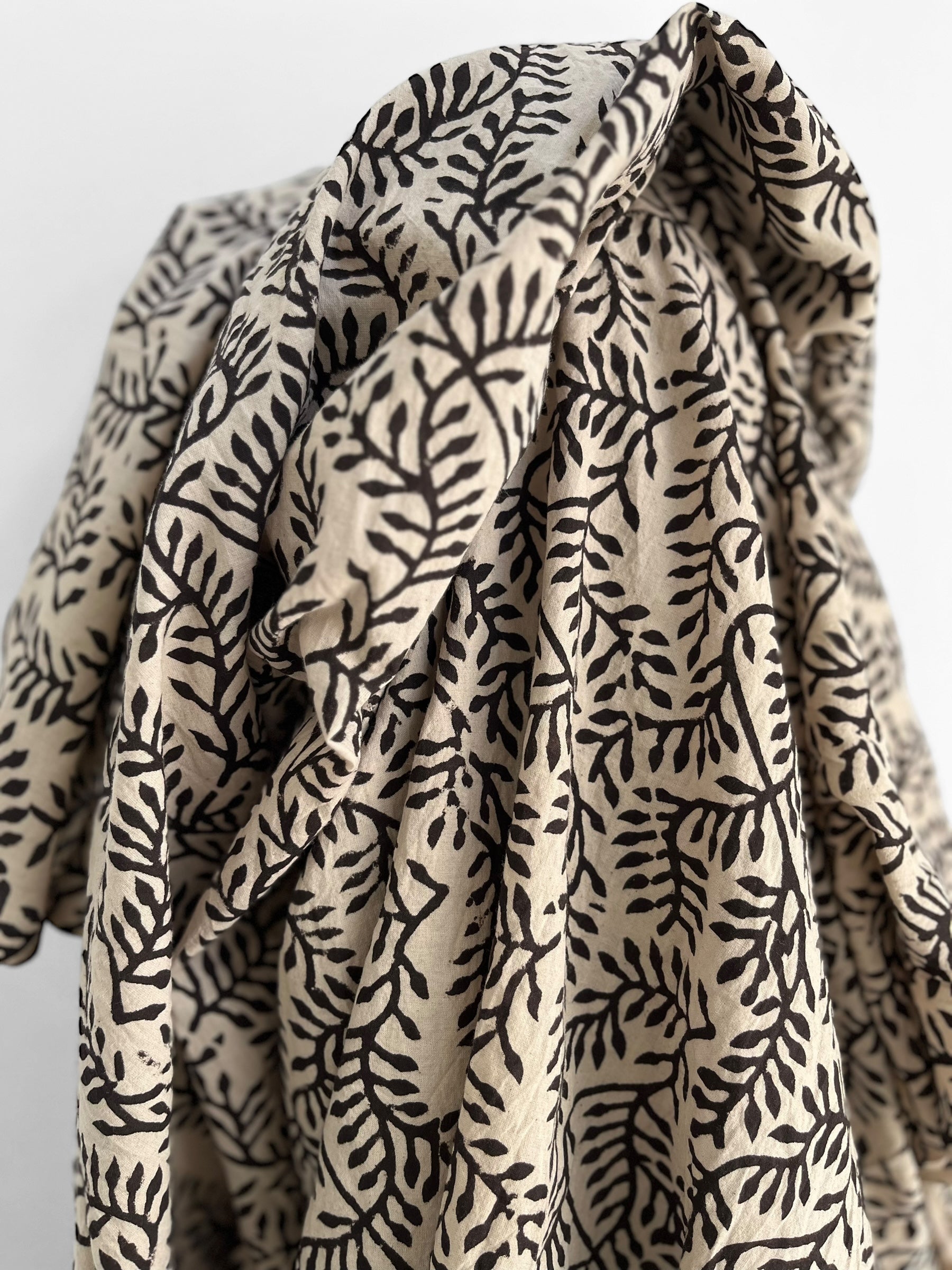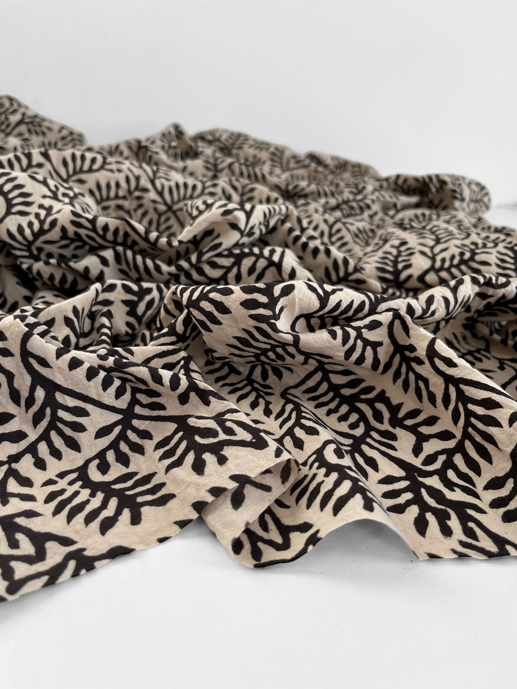 A monochrome block print featuring a black vine on a beige background - handcrafted by artisans in Jaipur, India, utilising traditional processes and natural colours.