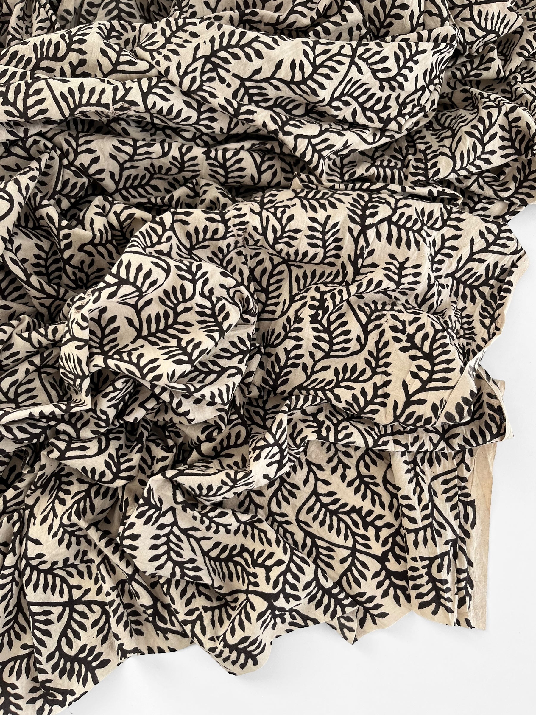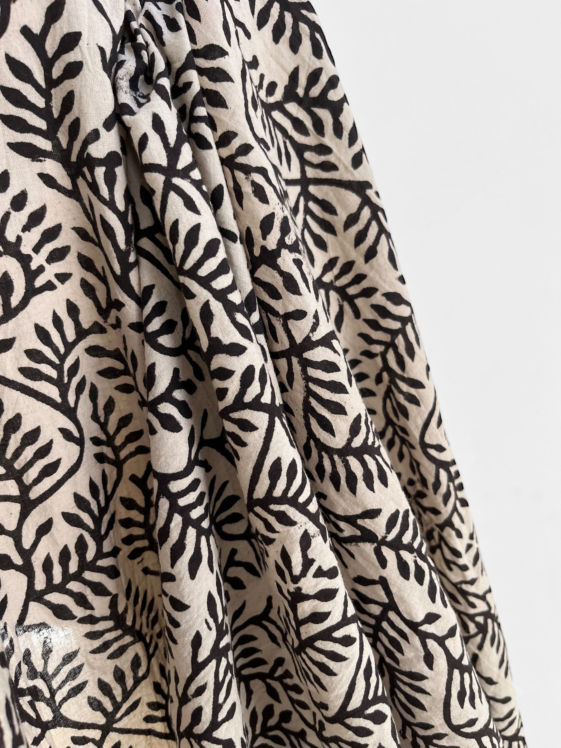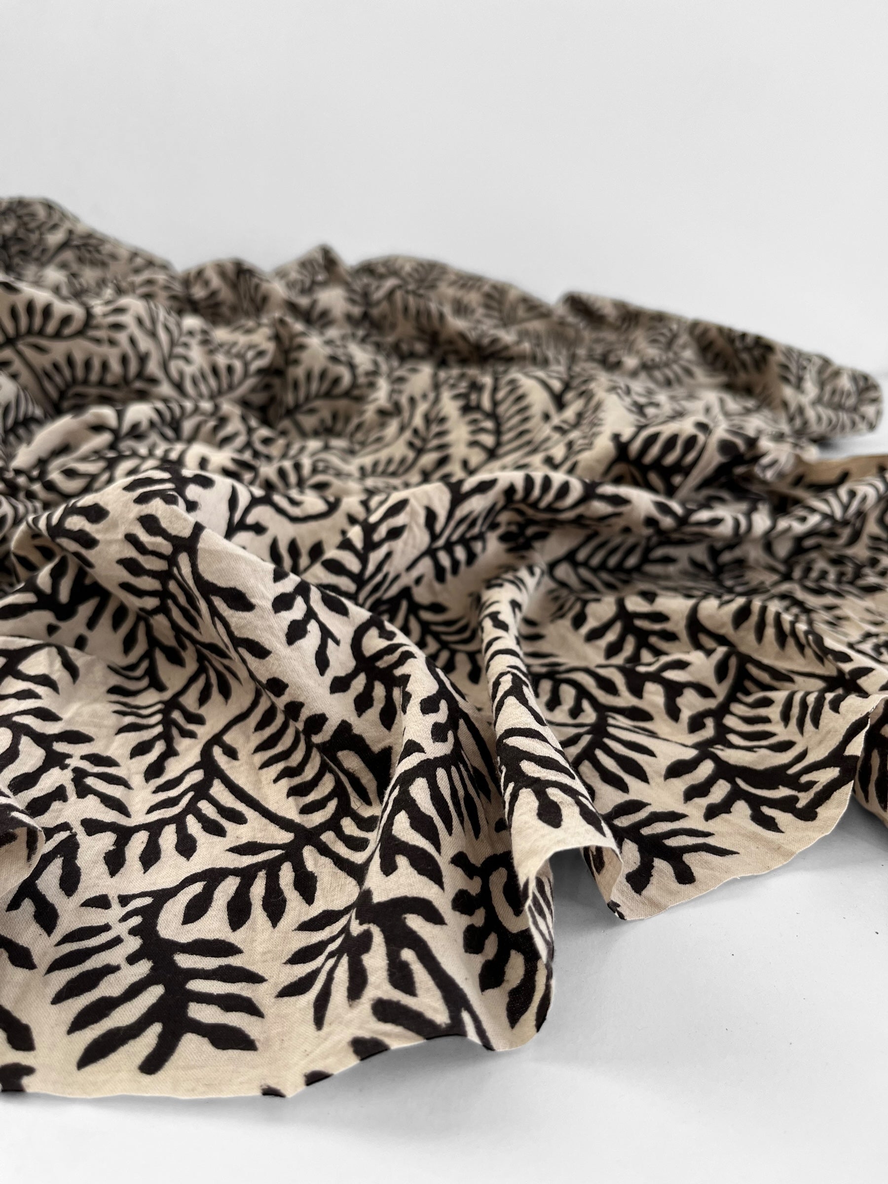 A monochrome block print featuring a black vine on a beige background - handcrafted by artisans in Jaipur, India, utilising traditional processes and natural colours.